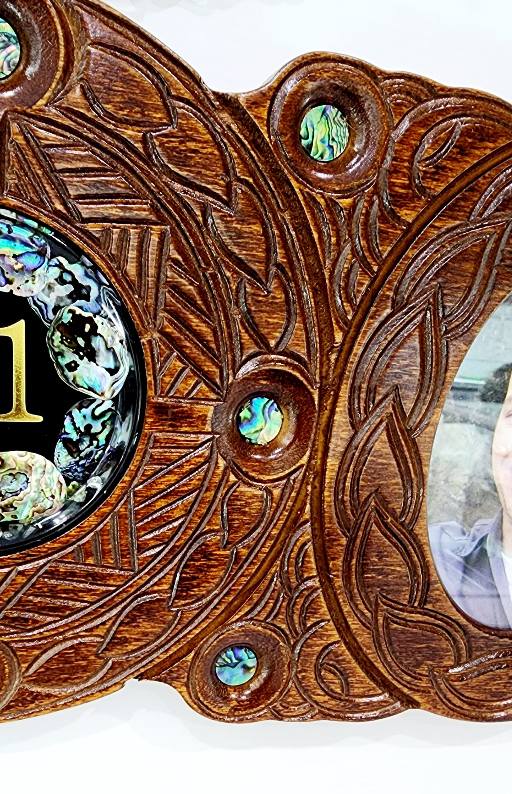 This stunning beaitiful 21st key is made out of Kauri Wood. The key is hand carved in New Zealand by local carvers. The key has 9x round paua shell eyes around the key with round paua shell disk. The disk has gold gold foil “21” inside the disk.