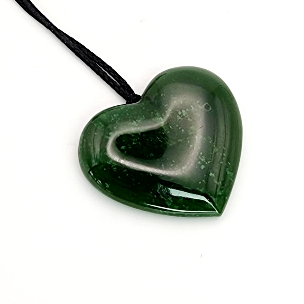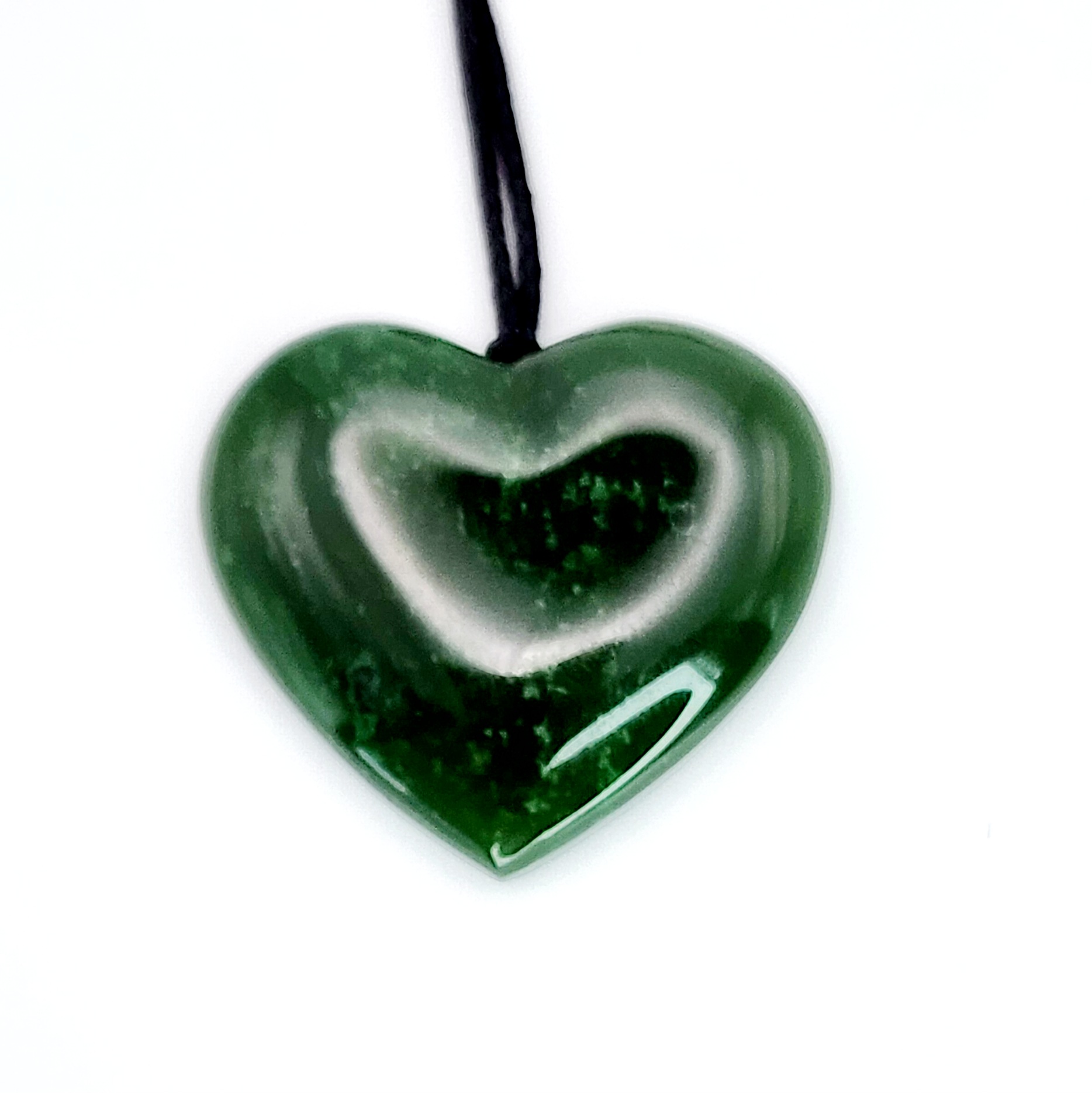 Genuine New Zealand Pounamu (Greenstone), sourced and hand carved in Aotearoa (New Zealand). Pounamu is of great cultural significance for M?ori and is believed to enhance mana (prestige) of its possessor. The Greenstone heart necklace comes with on a traditional adjustable black waxed cord.