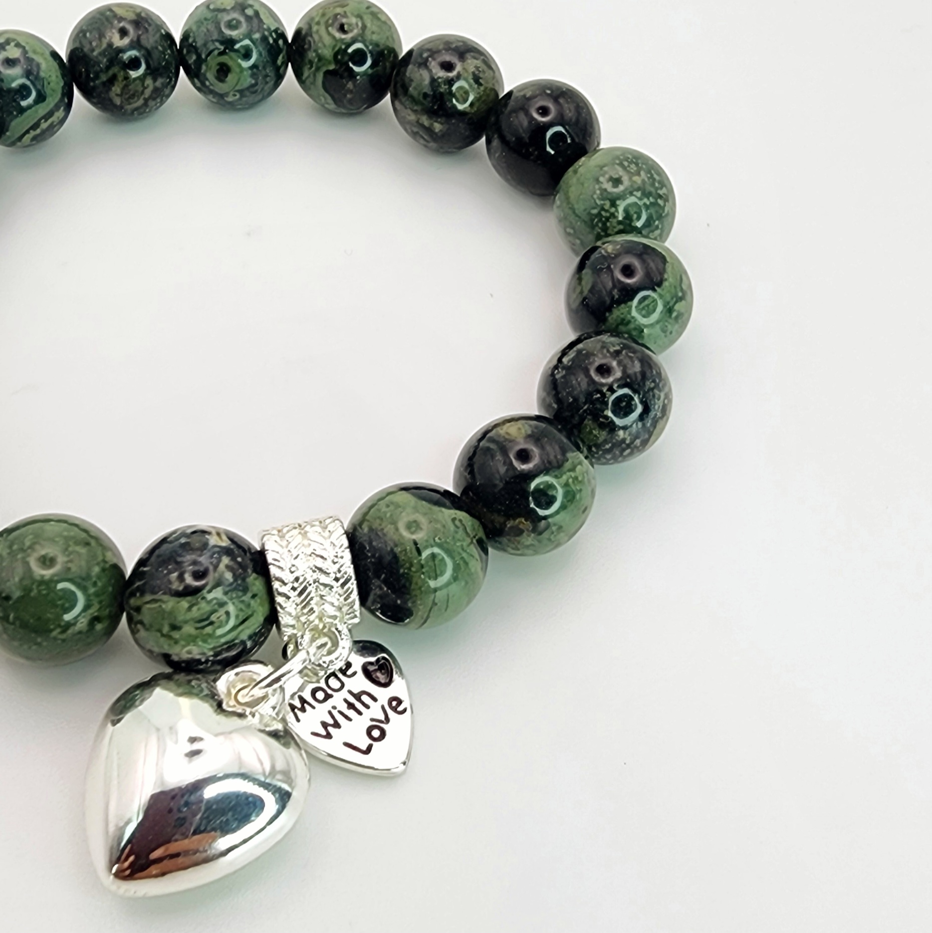 Stretchy elastic New Zealand Greenstone bead bracelet with silver plated charm.