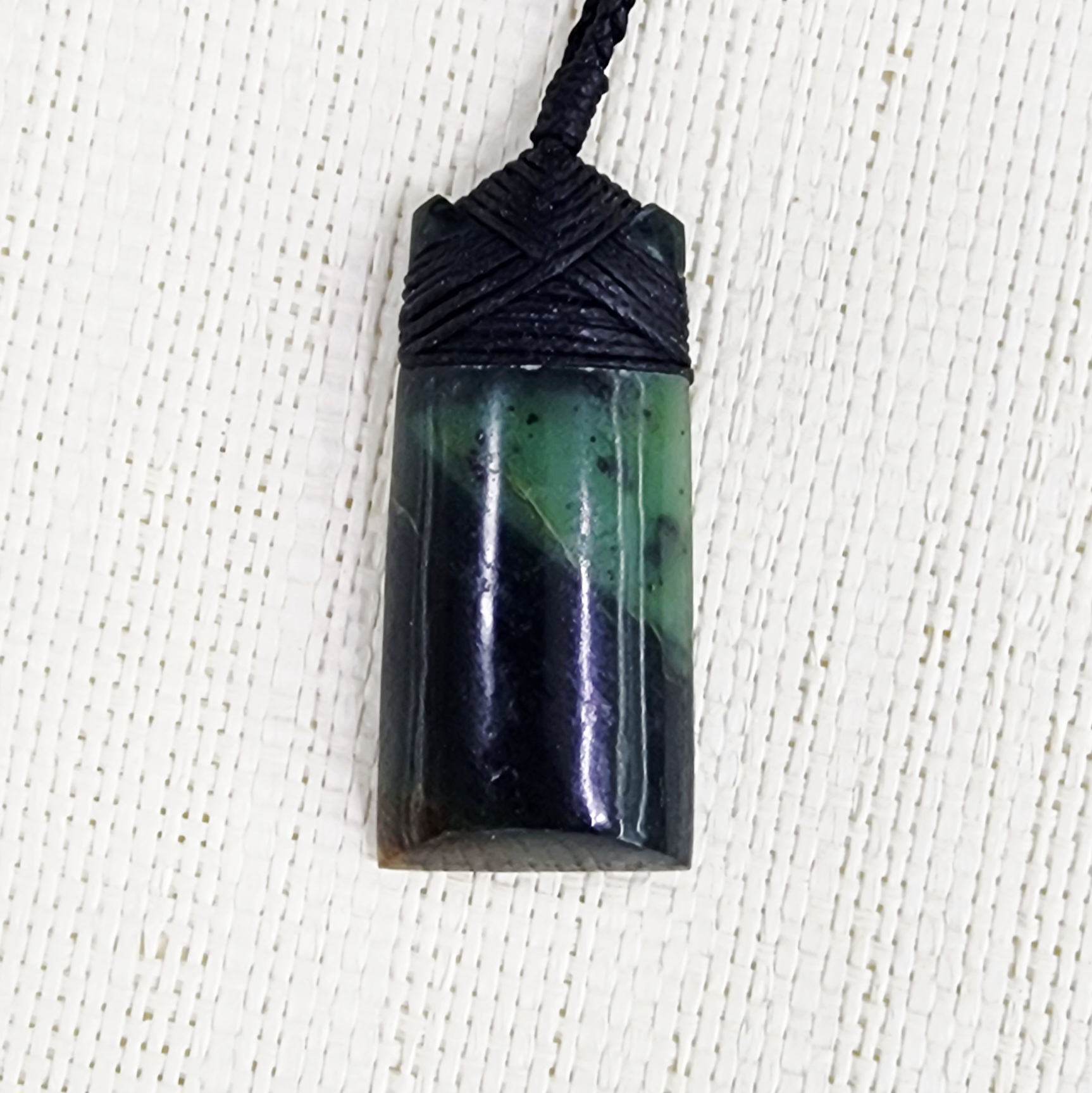 The pendant is paired with a durable black adjustable slipknot cord, allowing for a comfortable and customizable fit for everyday wear. Each piece is unique, showcasing the natural variations in the greenstone, making it a timeless and meaningful accessory or gift.