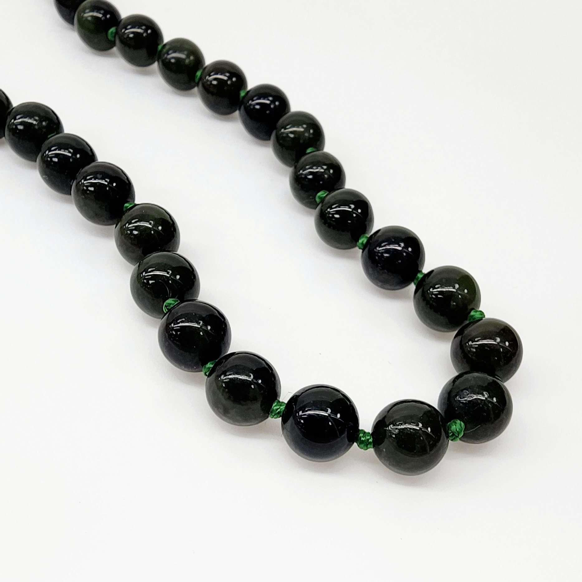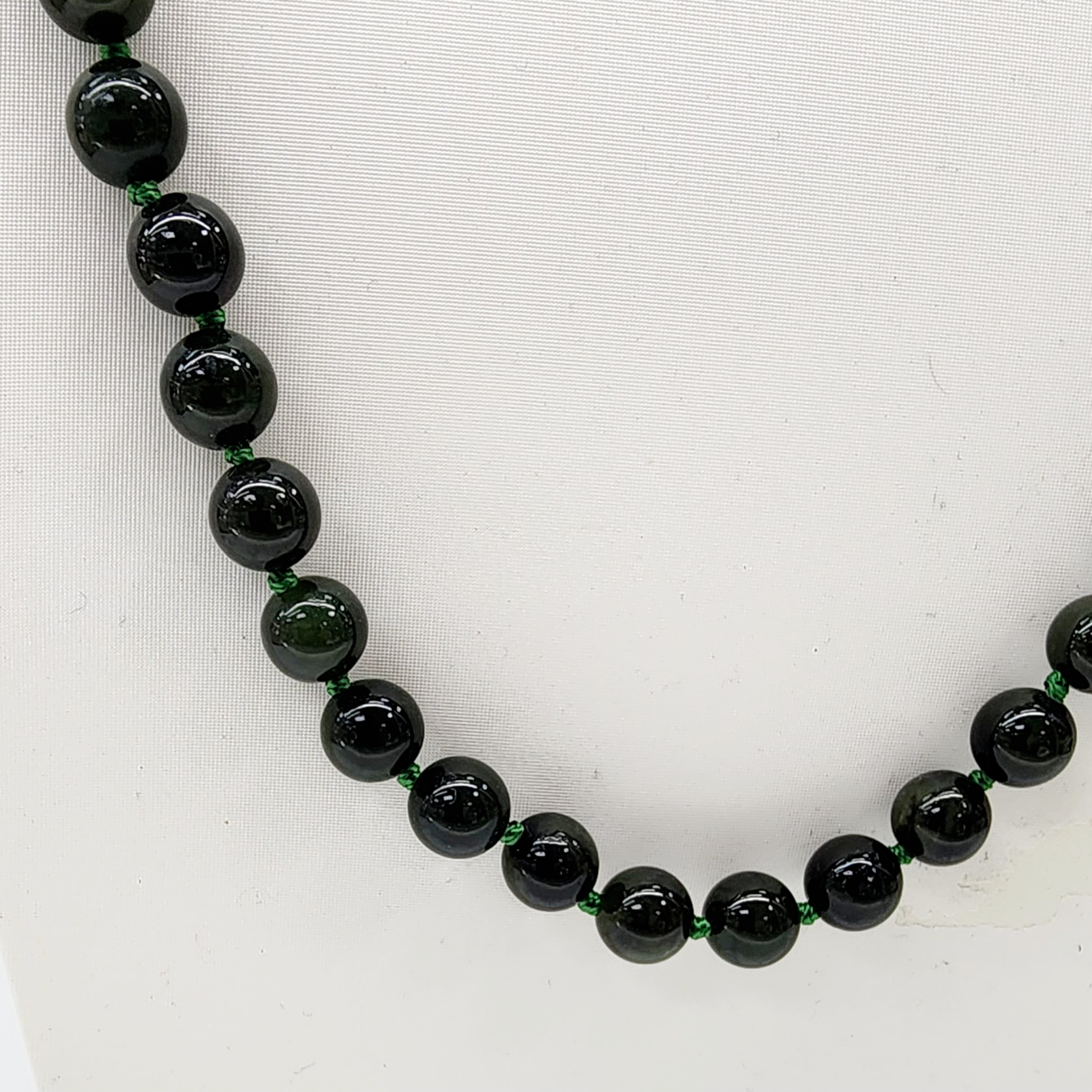 This necklace features 8mm round New Zealand Greenstone beads, each individually knotted for added durability and elegance. It measures approximately 76cm in length and is secured with a sturdy stainless steel parrot clasp, ensuring both style and functionality.