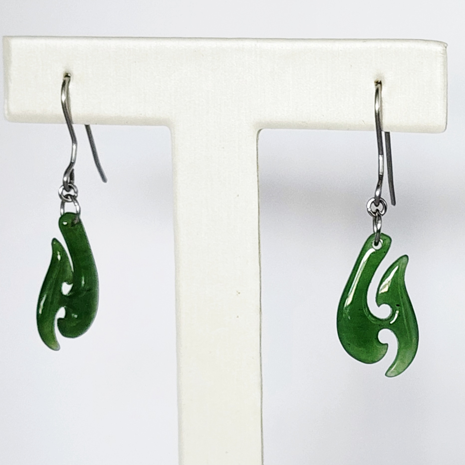 NZ Greenstone Fish Hook Earrings with Sterling Silver Hooks – E1637.55