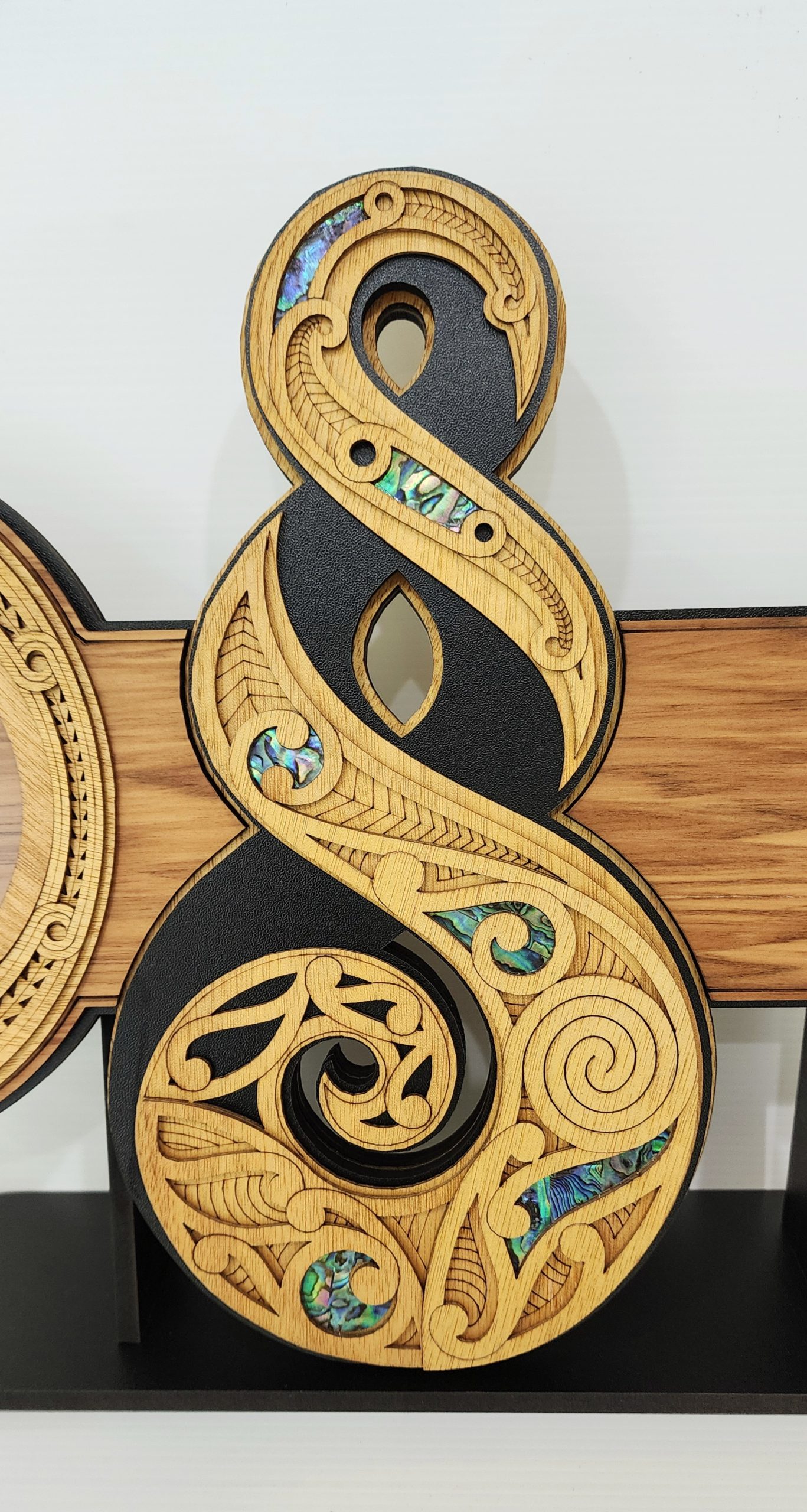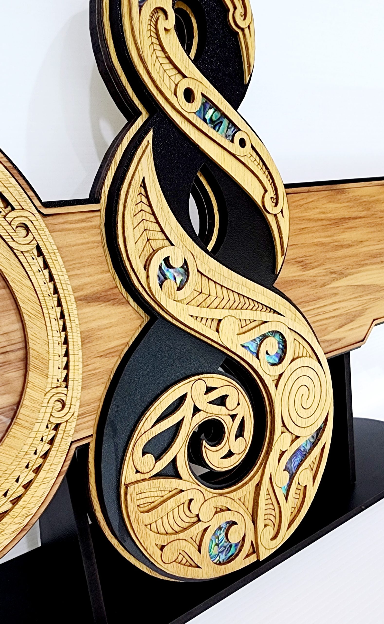 The key is crafted from recycled Native New Zealand Rimu veneerboard, medium density fibreboard (mdf), Gaboon veneer plywood and embellished with NZ Paua shell.