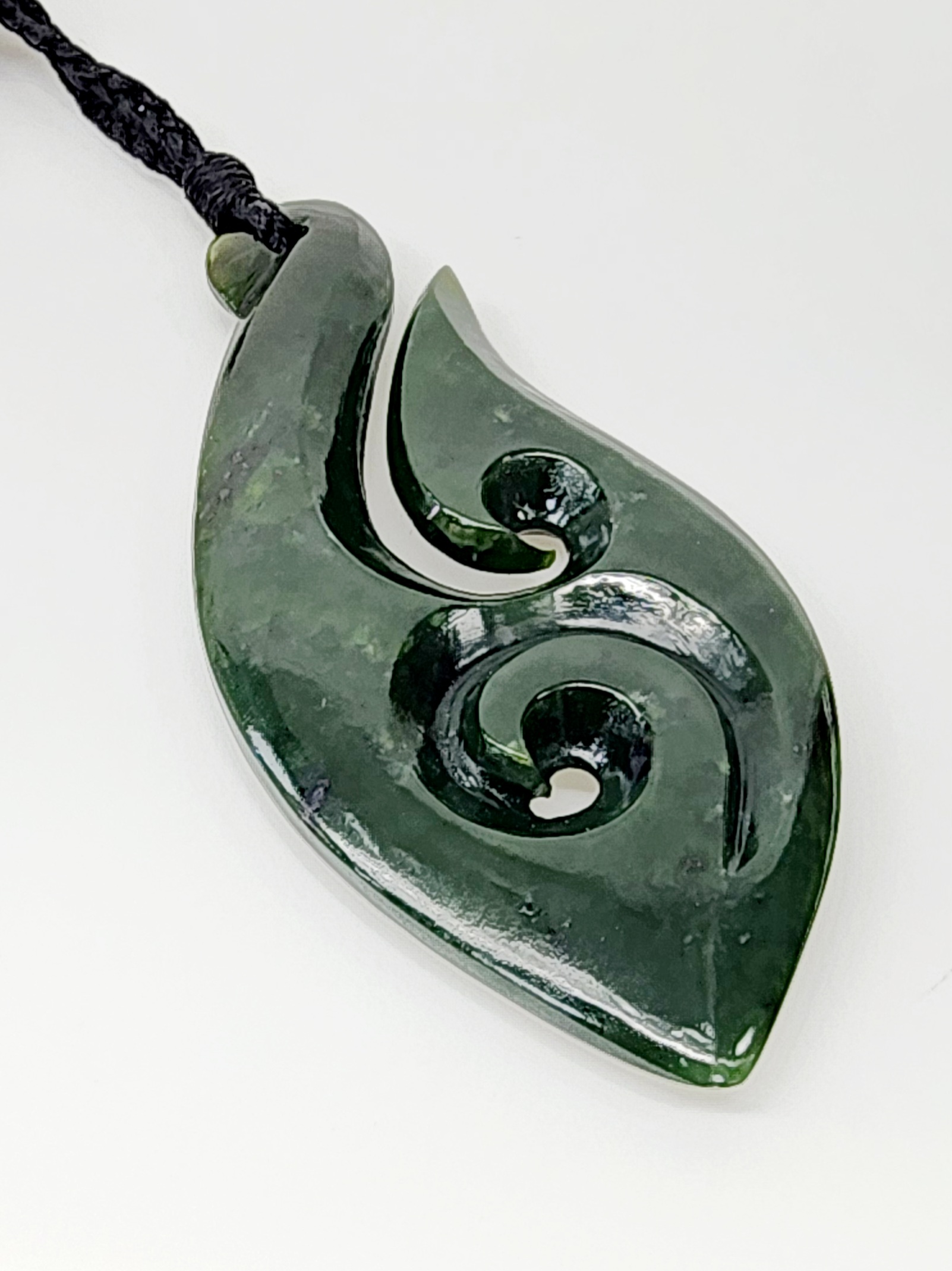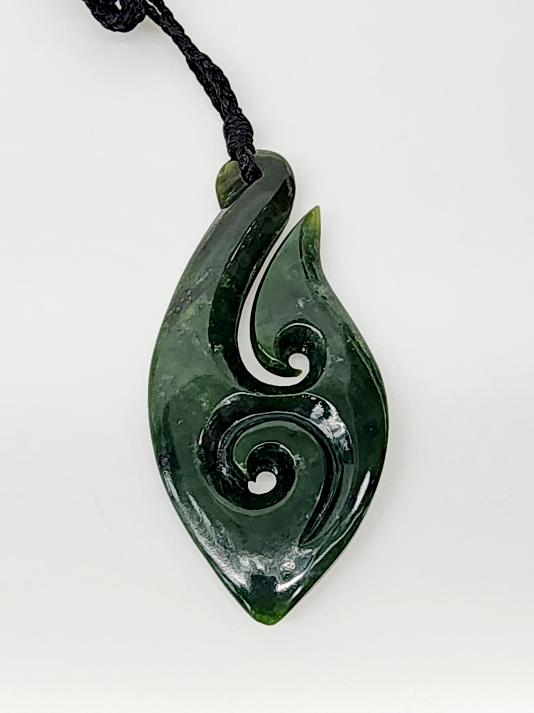 Genuine New Zealand Pounamu (Greenstone), sourced and hand carved in Aotearoa (New Zealand). Pounamu is of great cultural significance for Maori and is believed to enhance mana (prestige) of its possessor. This intricate, hand-carved pendant of New Zealand Pounamu is an elegant addition to any look, suspended from an adjustable cord.