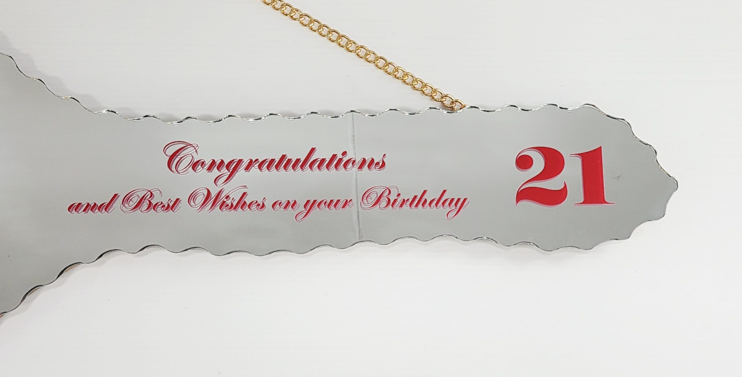 Our Mirrored 21st keys come with a 13mm MDF backing so your key can be signed by guests and loved ones. They also feature scalloped edges and a gold look chain to hang from. Dimensions: 524 x 205mm.