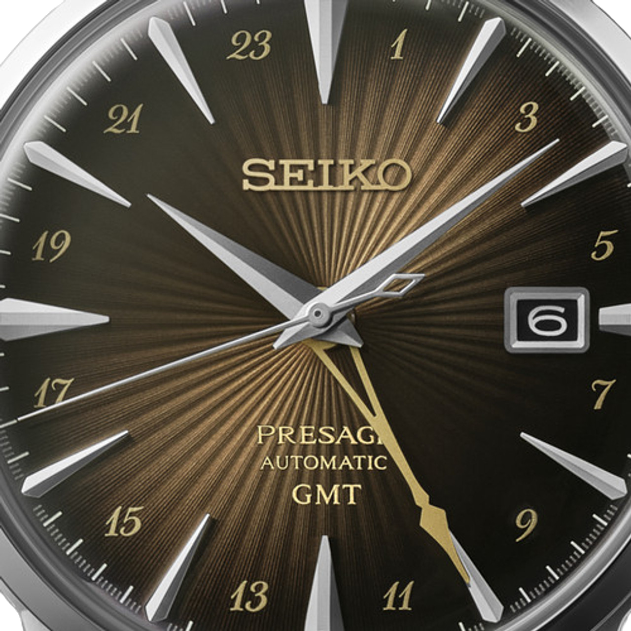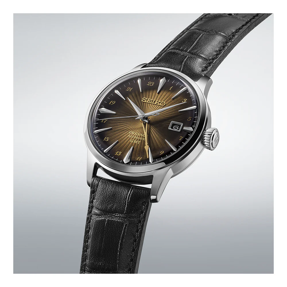 Seiko Presage GMT Rusty Nail Cocktail Time series mens Automatic Watch with a Deep Chocolate Brown dial SSK039J. Case Size 40.5mm