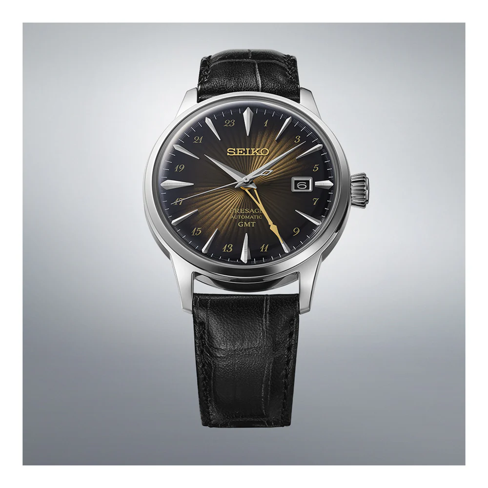 Seiko Presage Automatic GMT Black Leather Strap Watch – SSK039J1