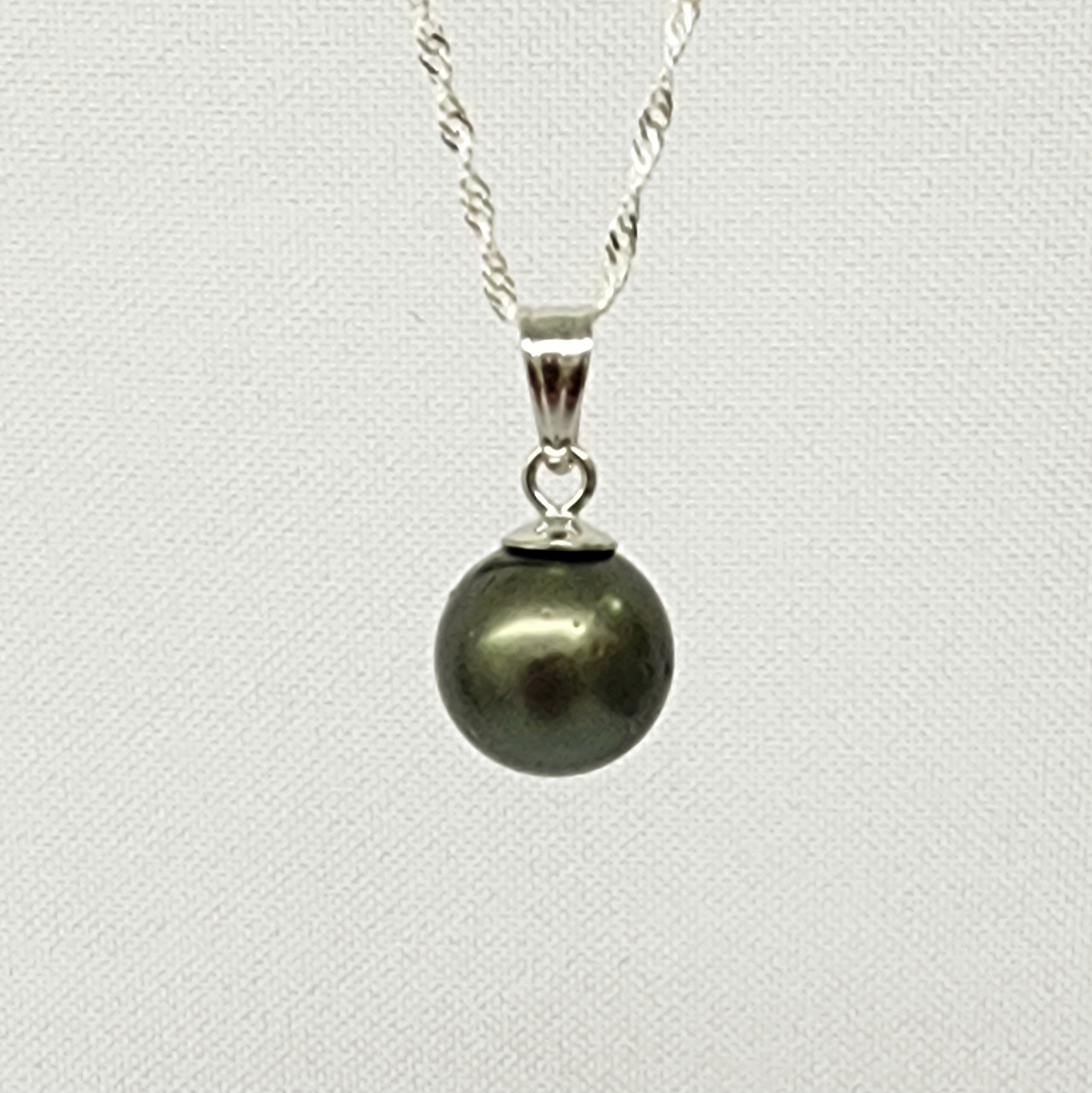 This elegant pendant showcases a genuine Cook Islands black pearl, round in shape and measuring approximately 10.0–10.5mm in diameter. The pearl is set with a sleek 6mm plain sterling silver cap, complemented by a flexible bale that allows for smooth movement and comfortable wear. The total height of the pendant, including the bale, is 20mm. It comes complete with a complimentary sterling silver chain, making it ready to wear or gift.