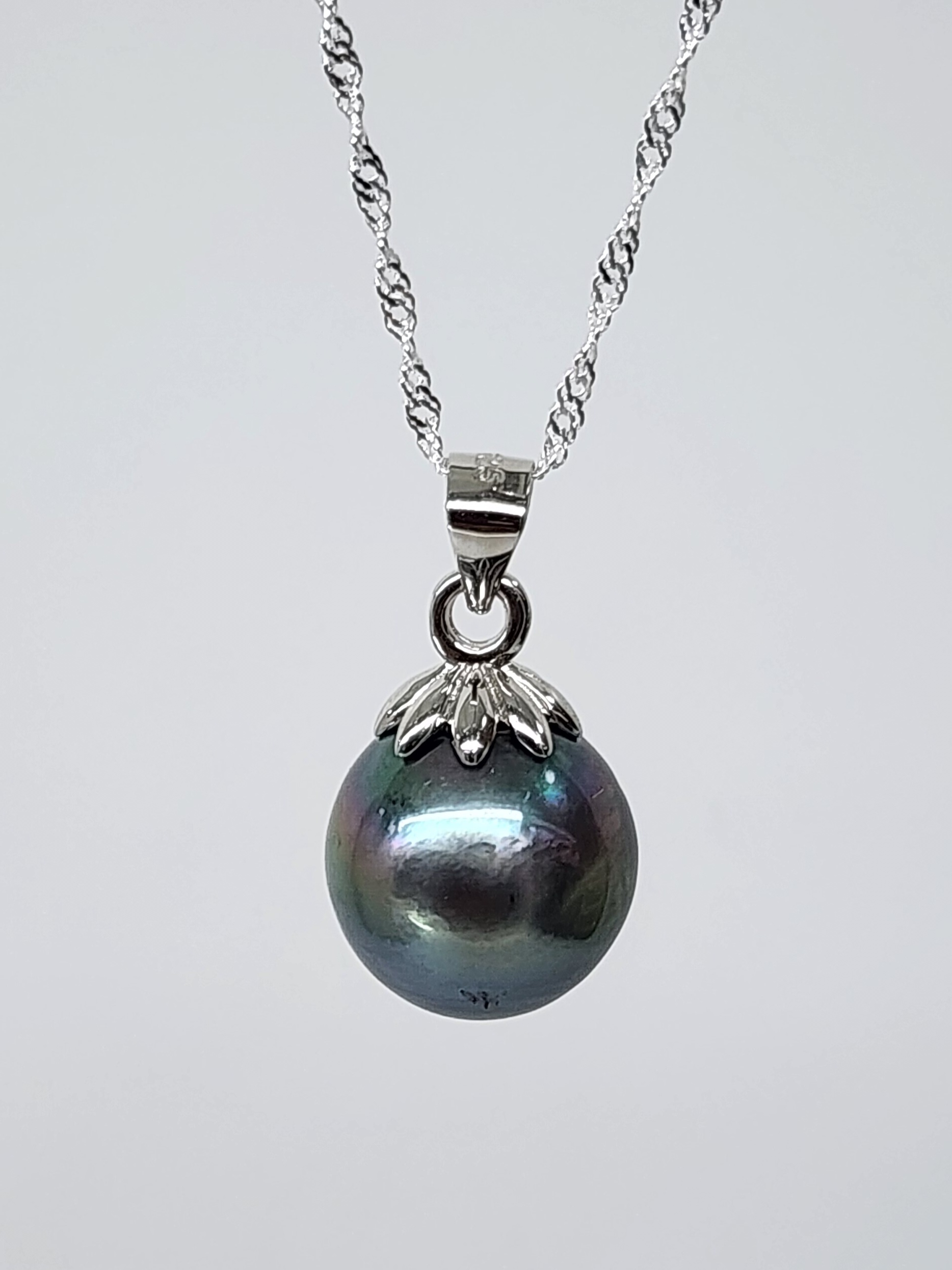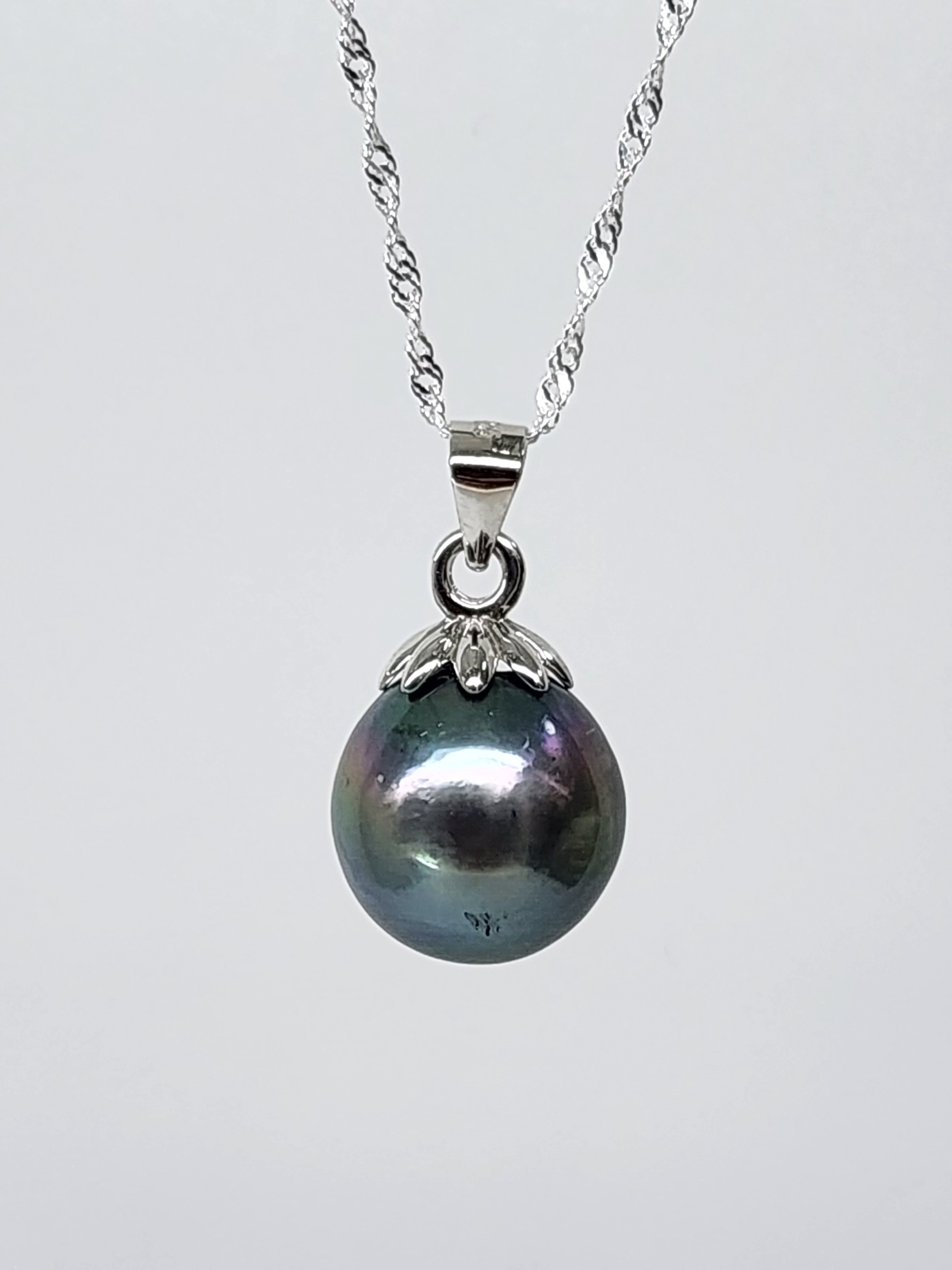 Sterling Silver 12-13mm Round Tahitian Green/Black Pearl Pendant with Sterling Silver Cap – SSTD02
