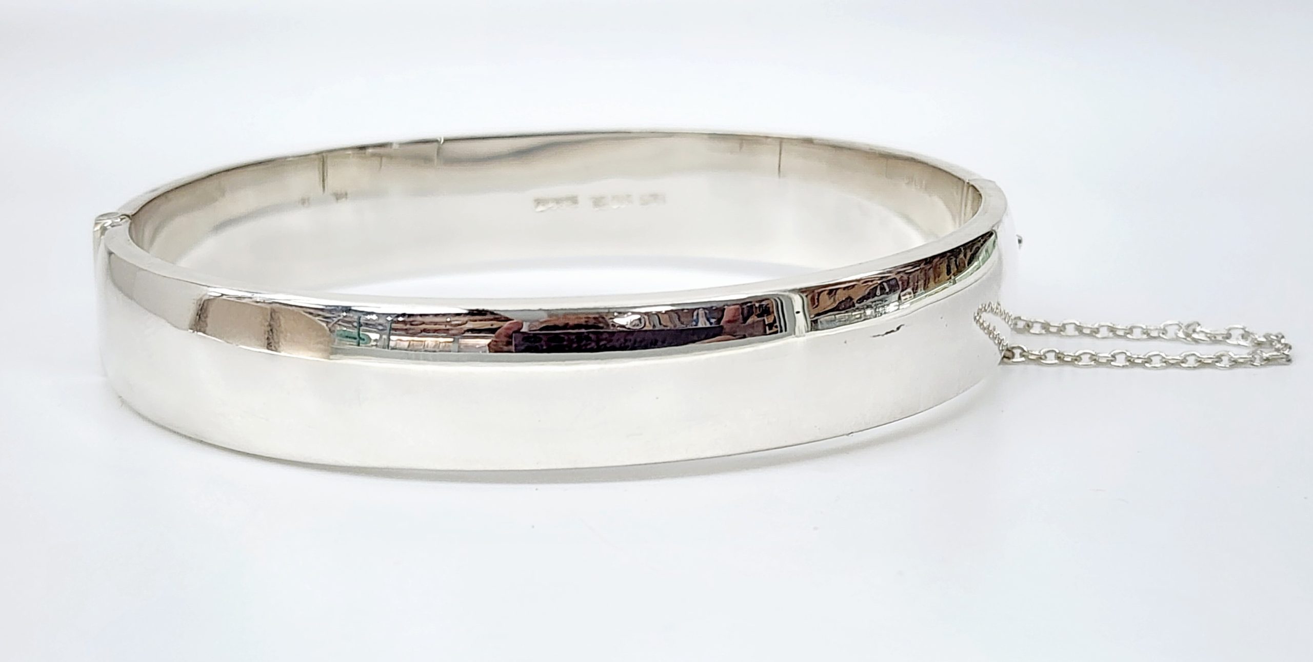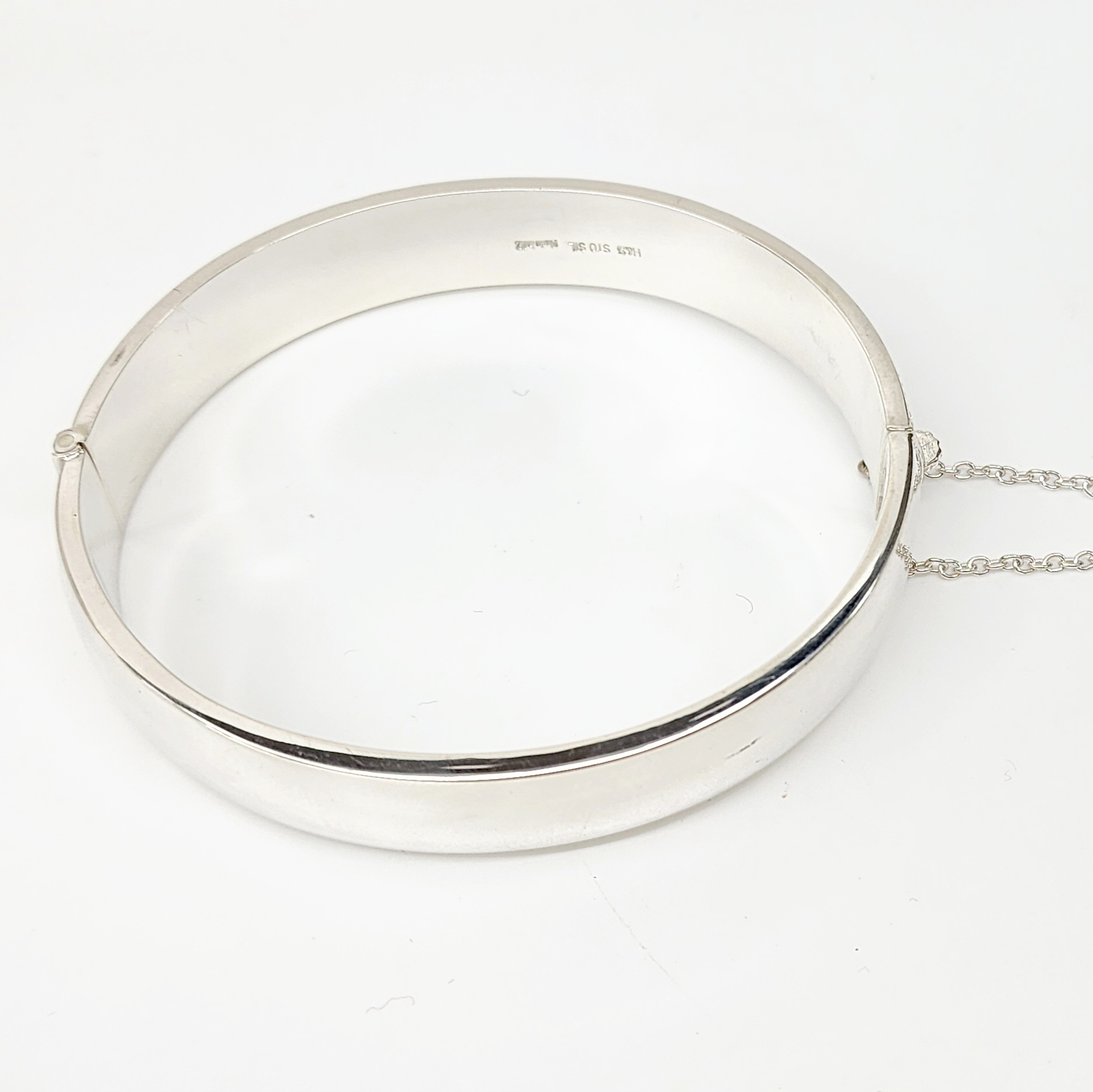 Sterling Silver 13mm Wide Engraved / Plain Hinged Oval Bangle with Safety Chain