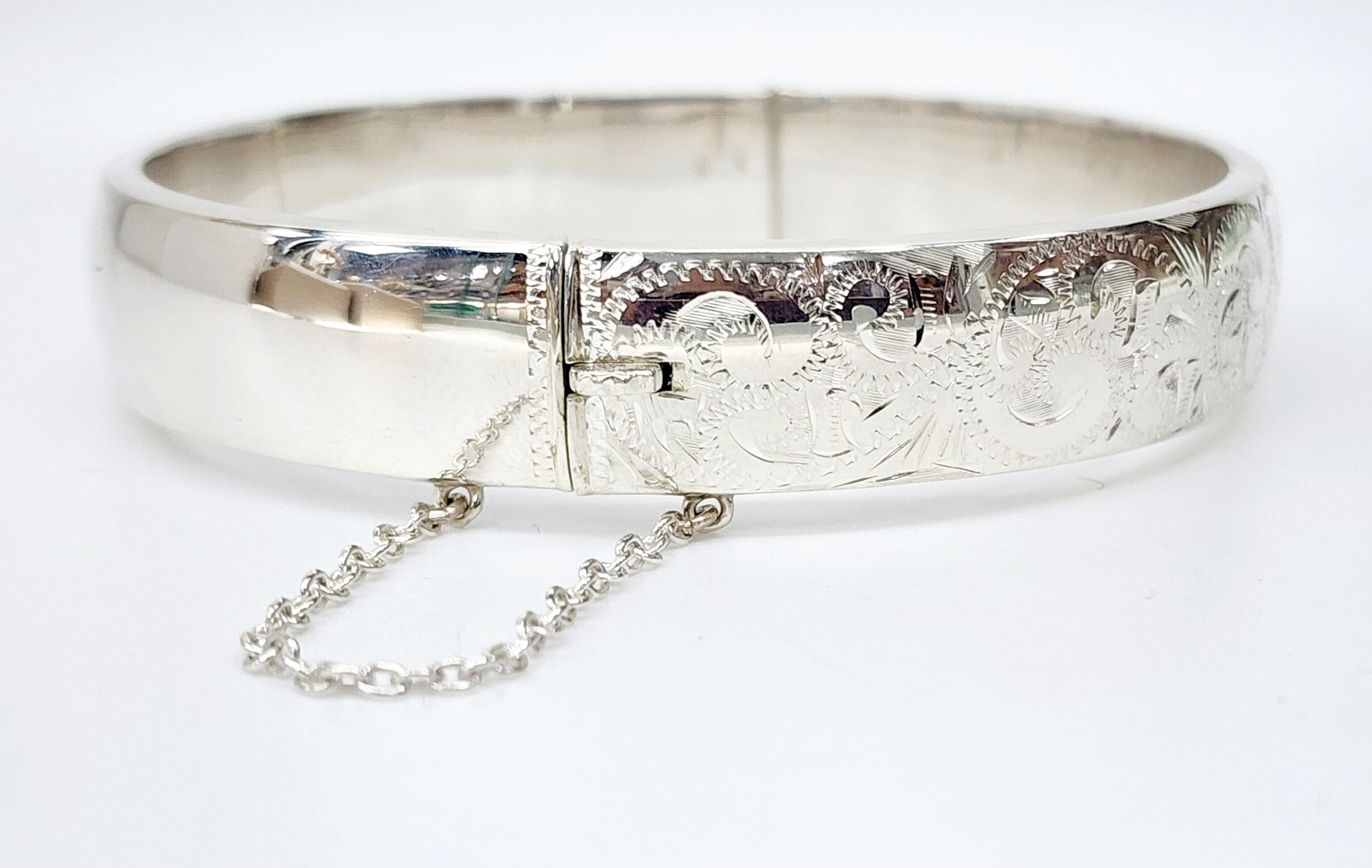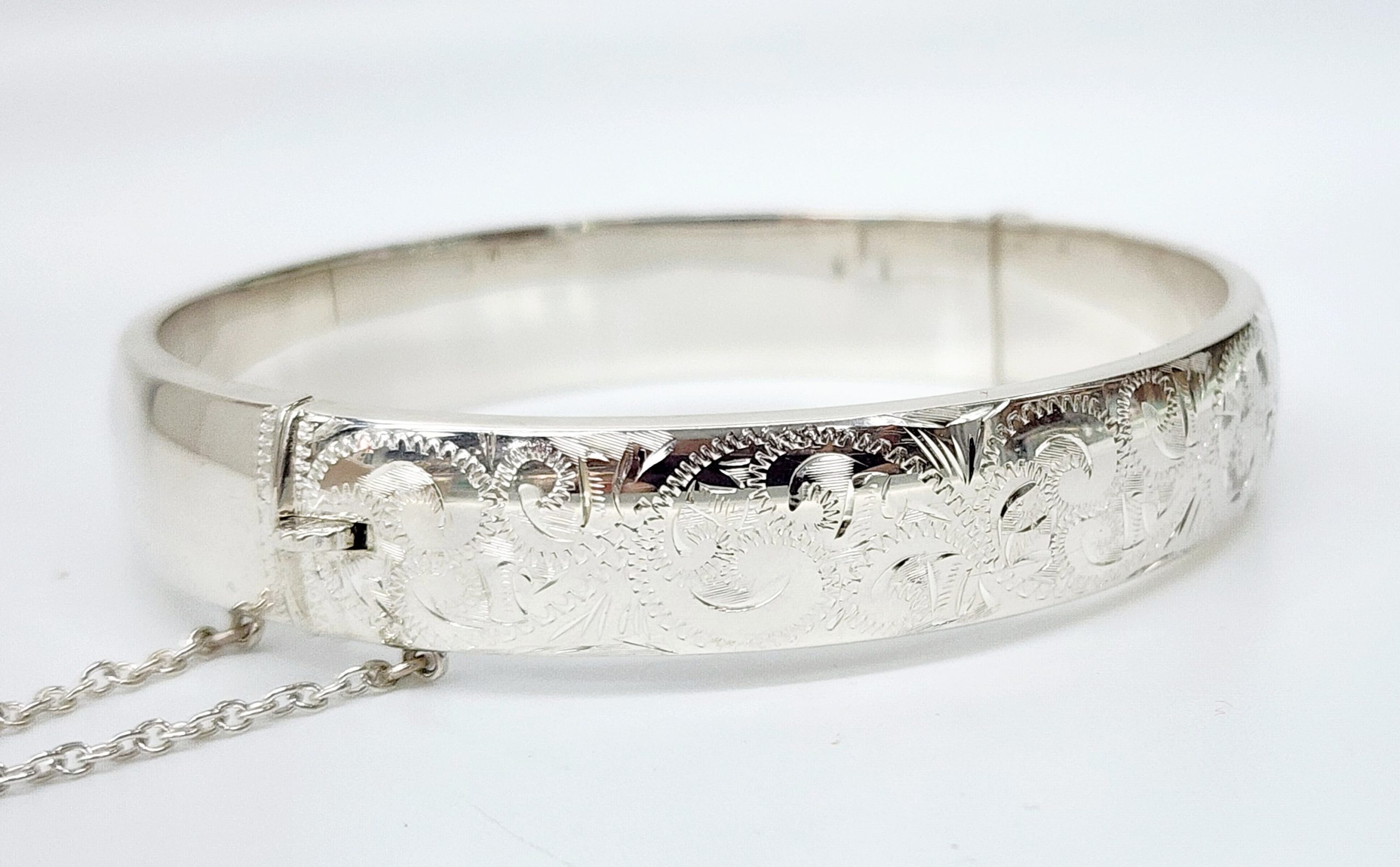 This elegant sterling silver bangle, combines classic design with exquisite craftsmanship. The bangle features a charming flower pattern engraved across its solid surface on the top half, adding a touch of vintage sophistication.