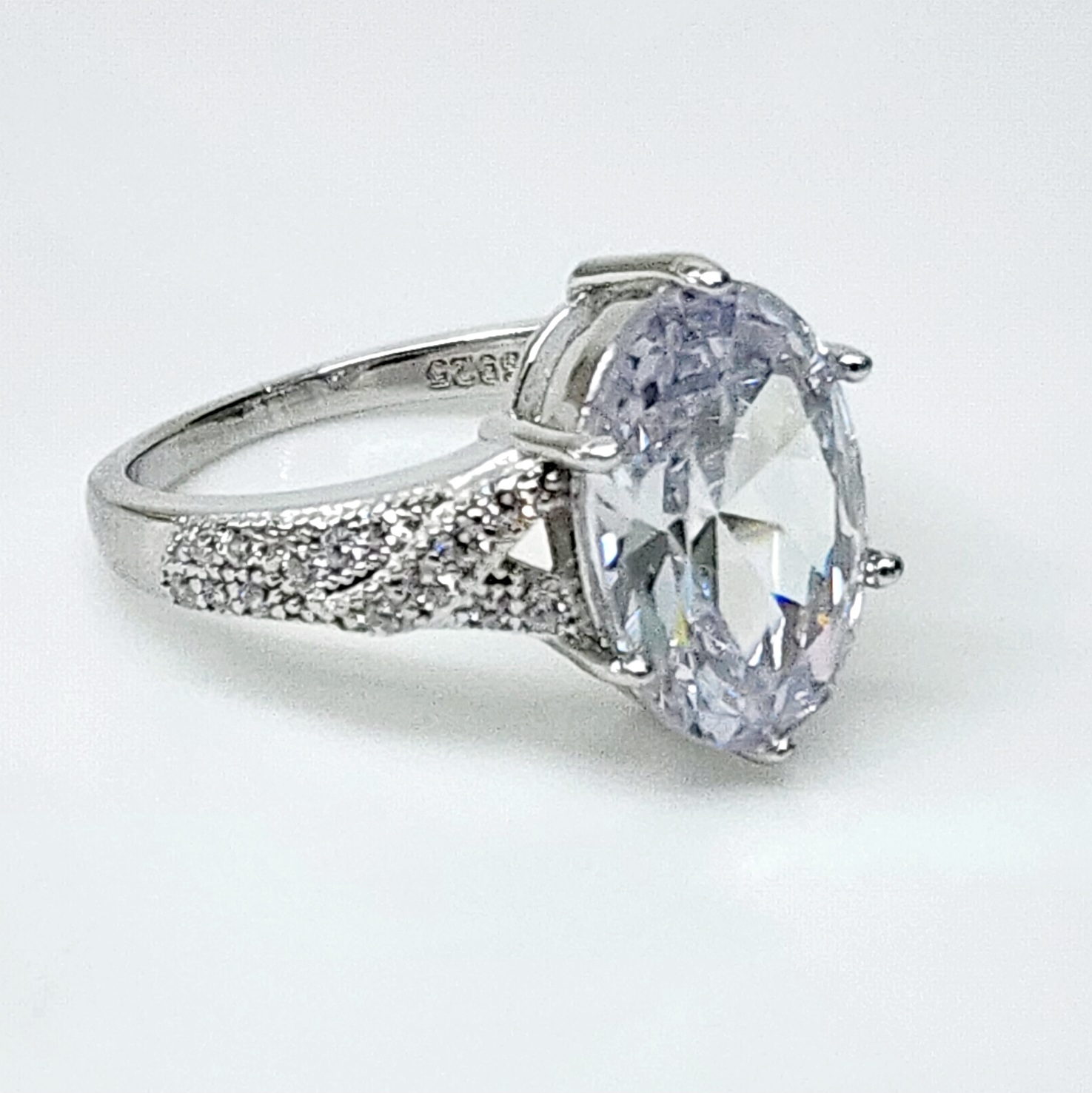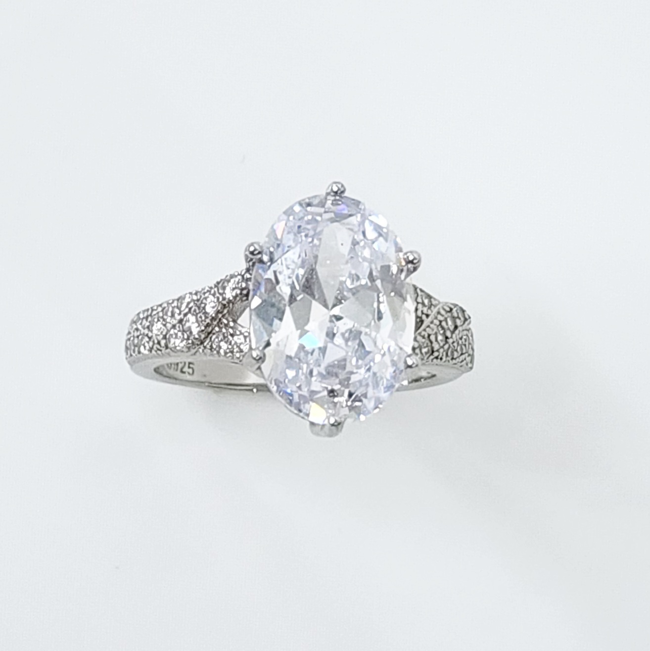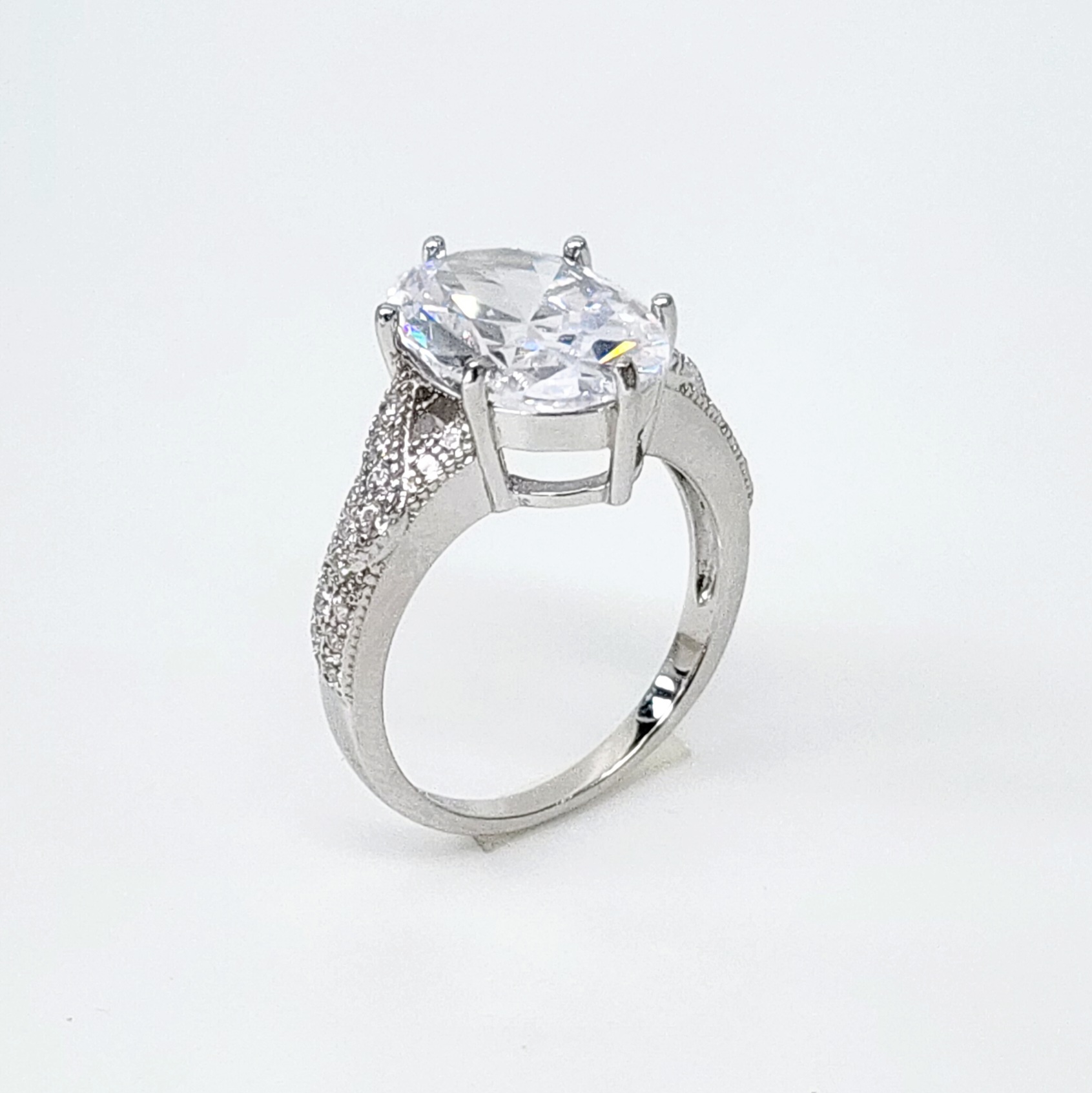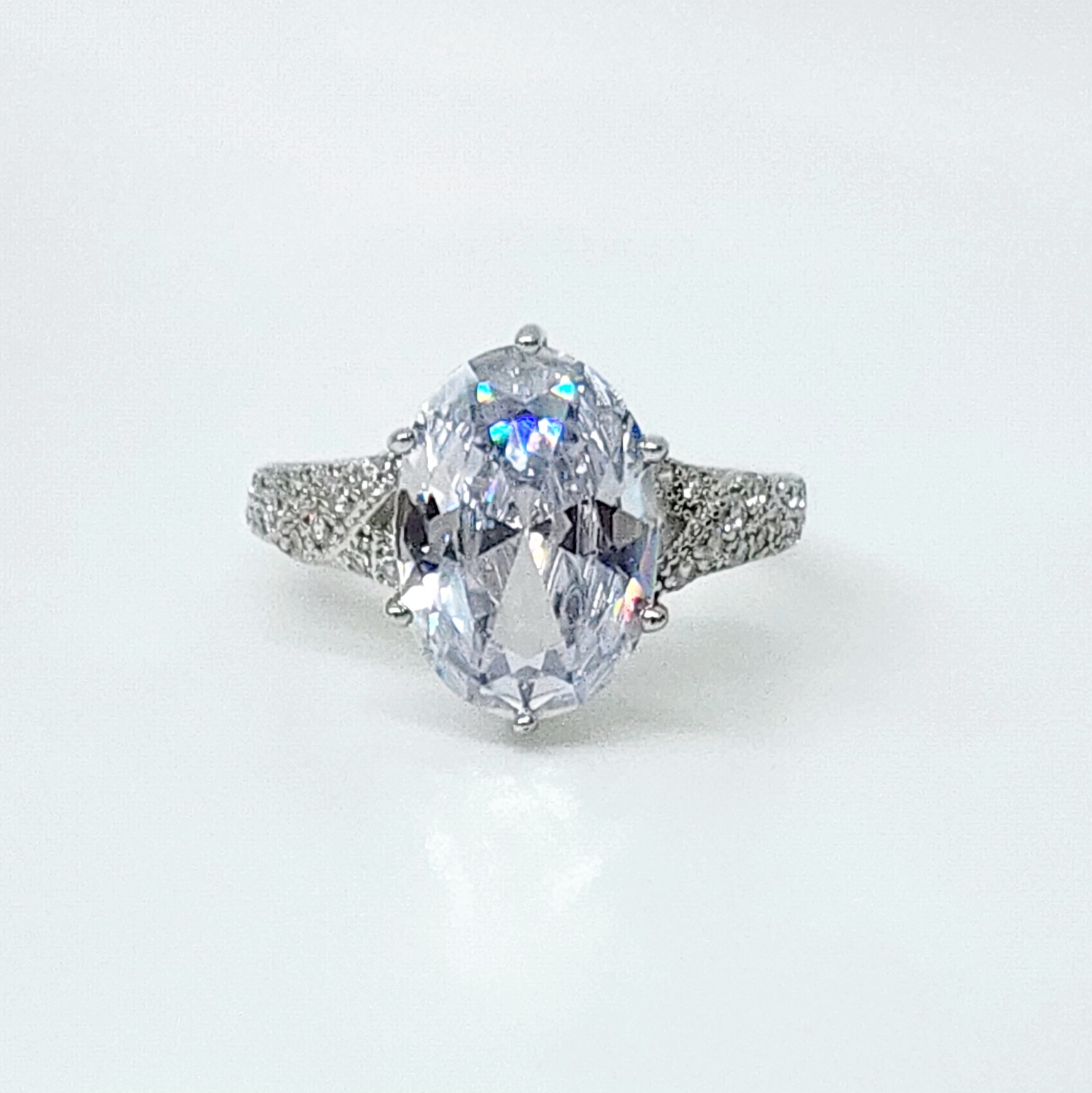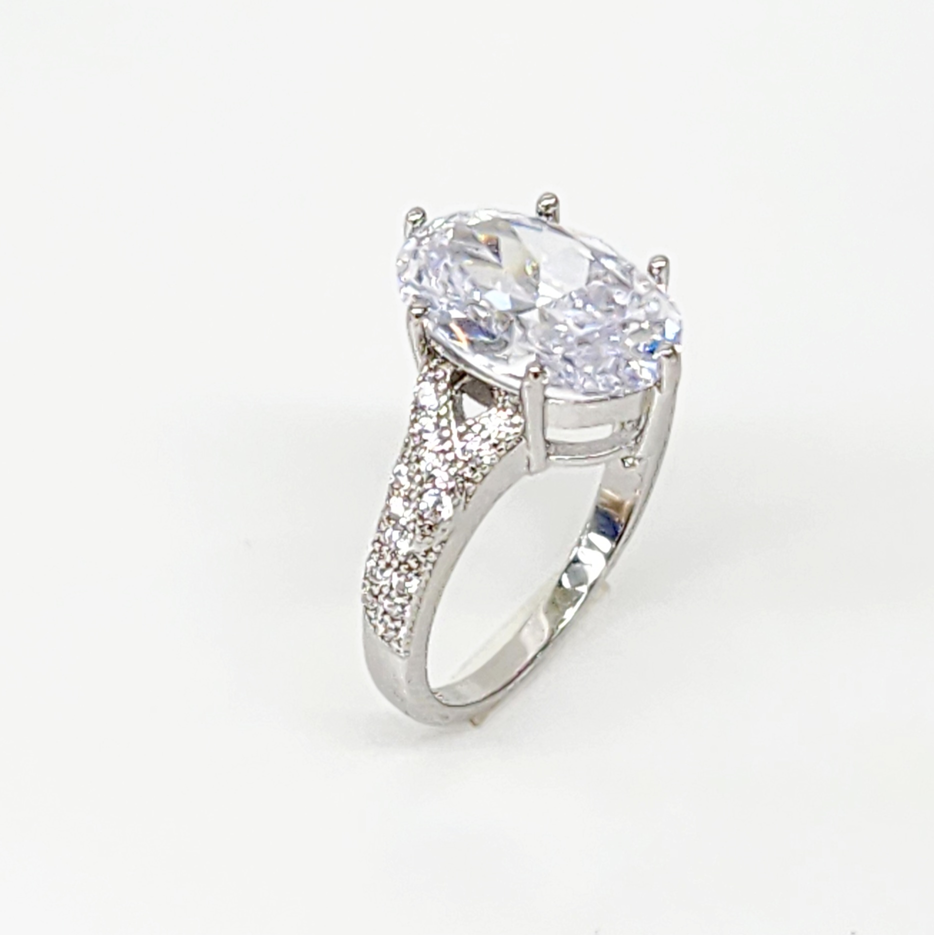 The split shank design of the band gives the ring a modern yet classic appeal. The shank splits into two as it approaches the center stone, creating a delicate and airy look that highlights the centerpiece. Each arm of the split shank is adorned with carefully set cubic zirconia stones, adding a touch of extra brilliance to the ring. These smaller stones are precisely aligned, creating a sparkling path that draws the eye towards the oval center stone.