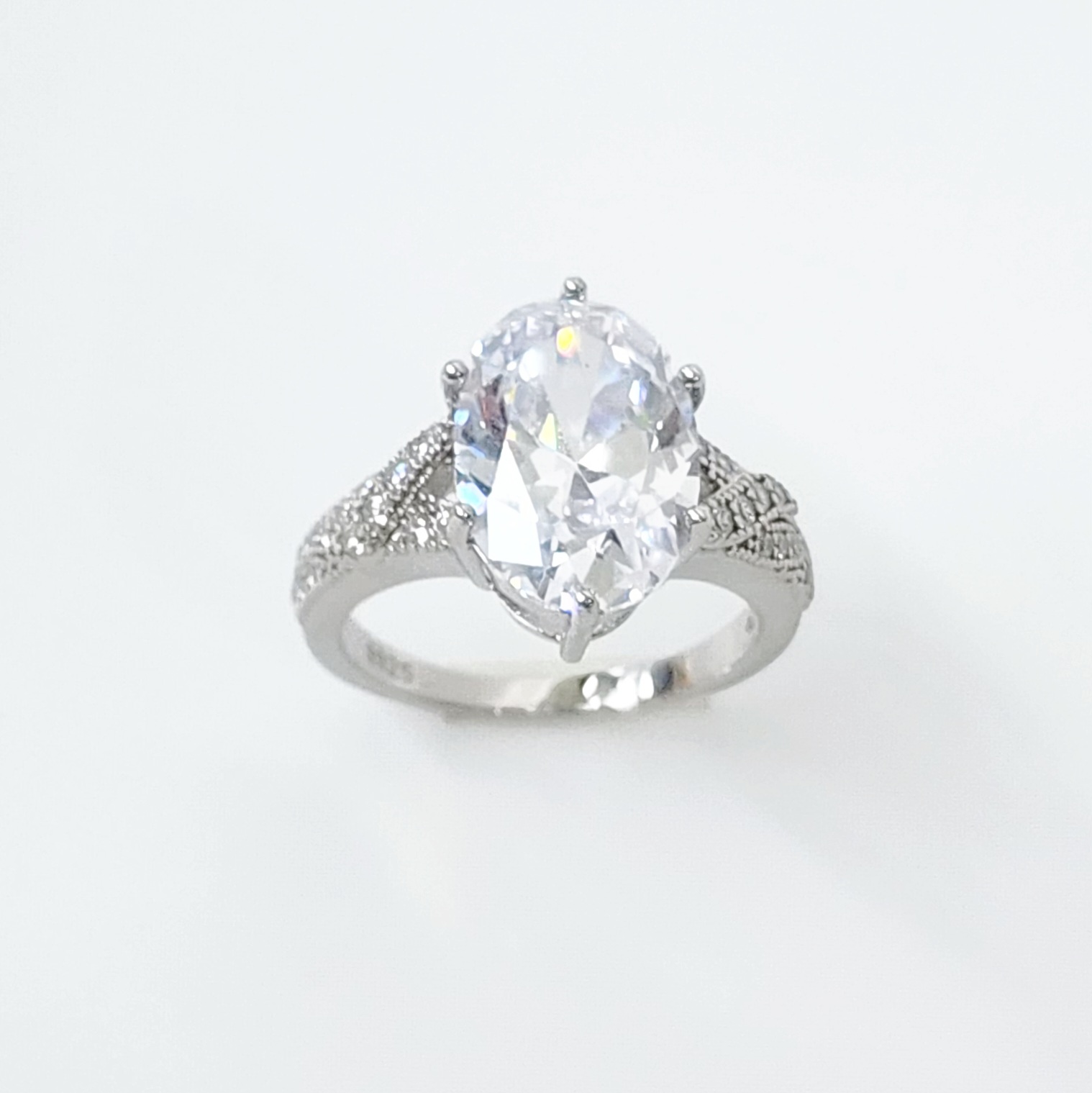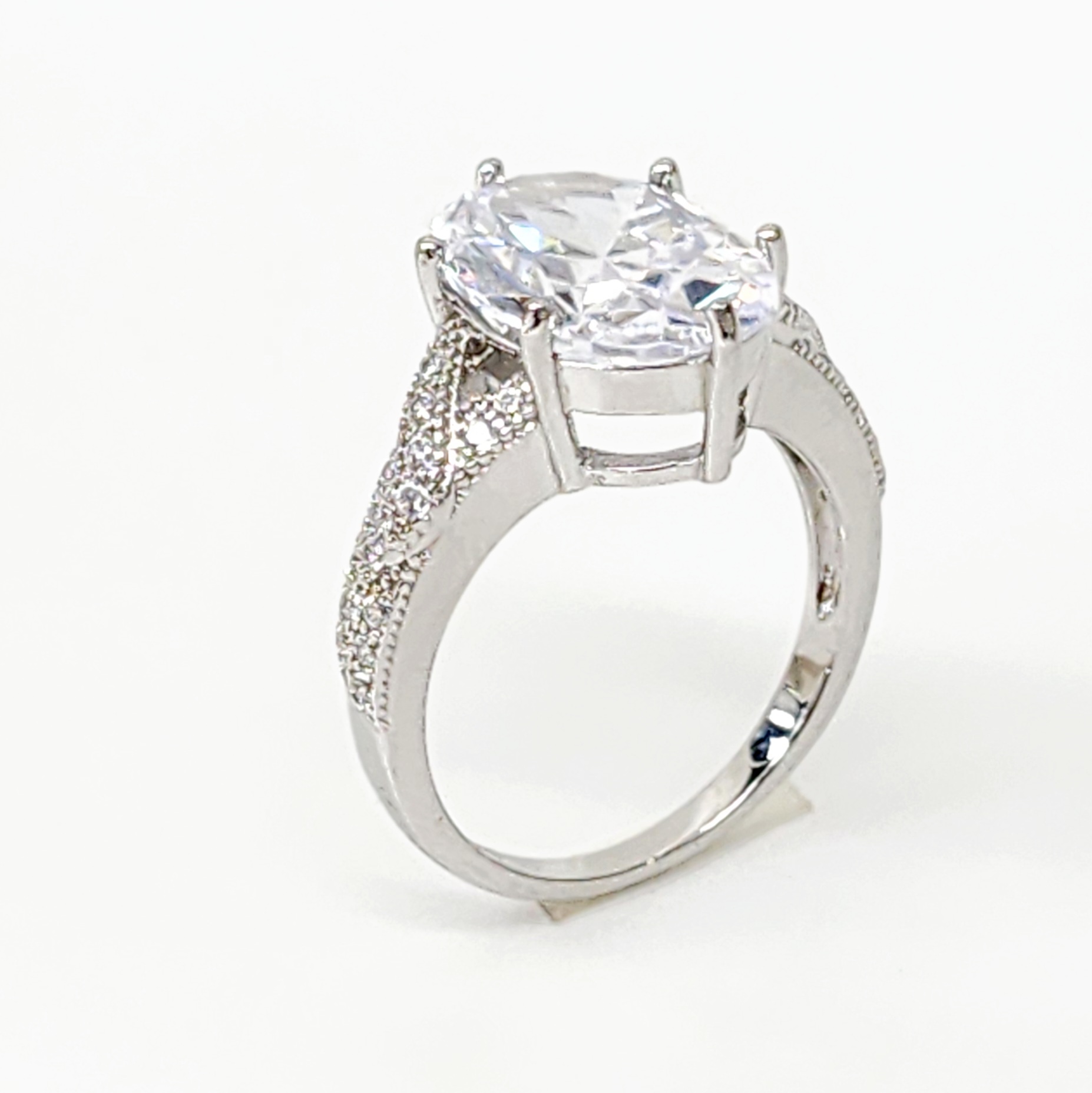 The combination of the large oval center stone with the intricate cubic zirconia detailing along the split shank creates a ring that is both luxurious and sophisticated, making it a perfect choice for an engagement ring.