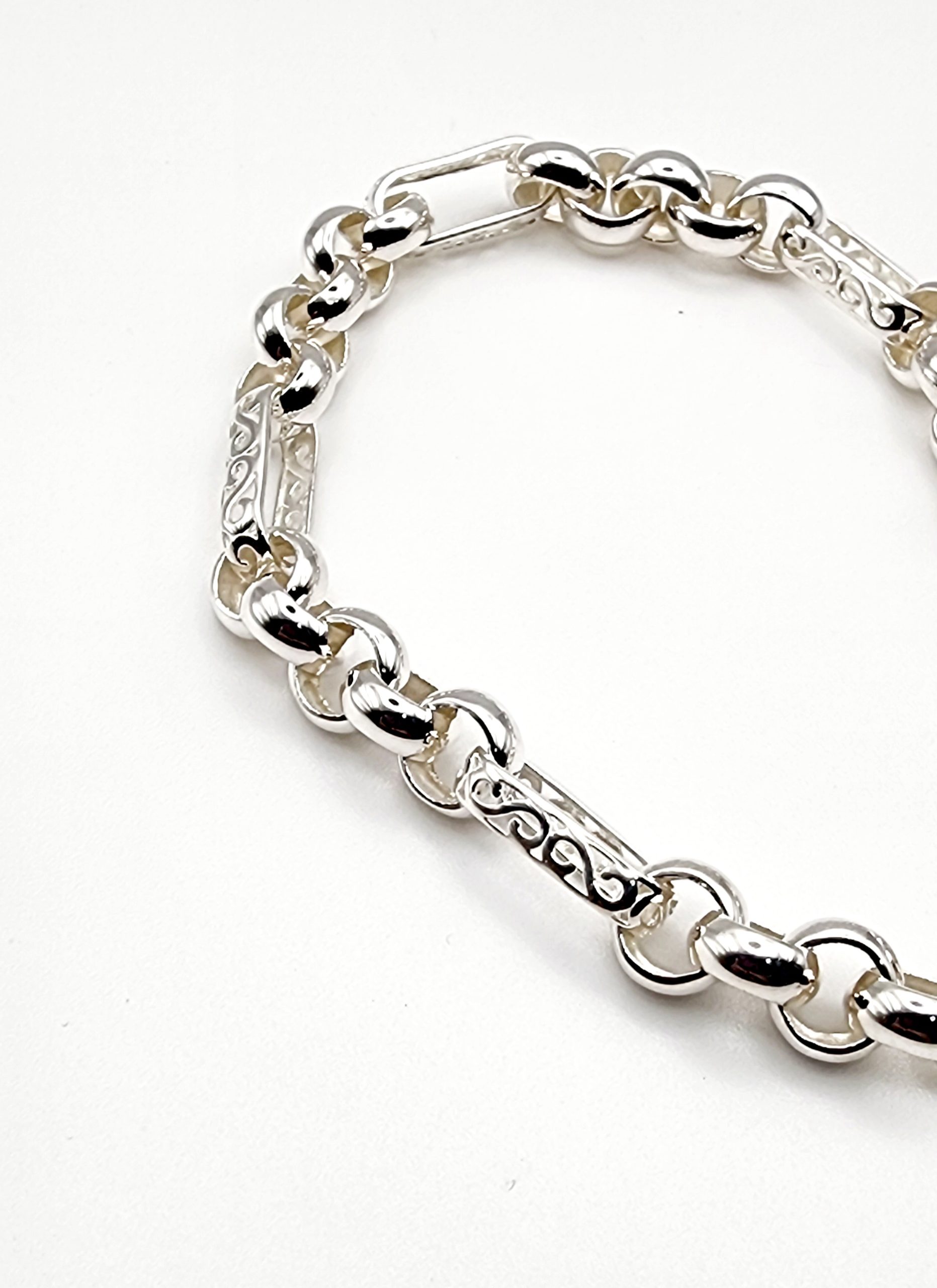 Sterling silver Figaro-style belcher link bracelet featuring a puff heart padlock charm. The puff heart padlock measures 16mm in width, adding an elegant and timeless centerpiece. The bracelet consists of alternating links: solid round belcher links measuring 8mm and oval filigree links that are 14mm in length, both with a width of 3.5mm. Designed for security and style, the bracelet is equipped with a functional safety chain for added peace of mind.