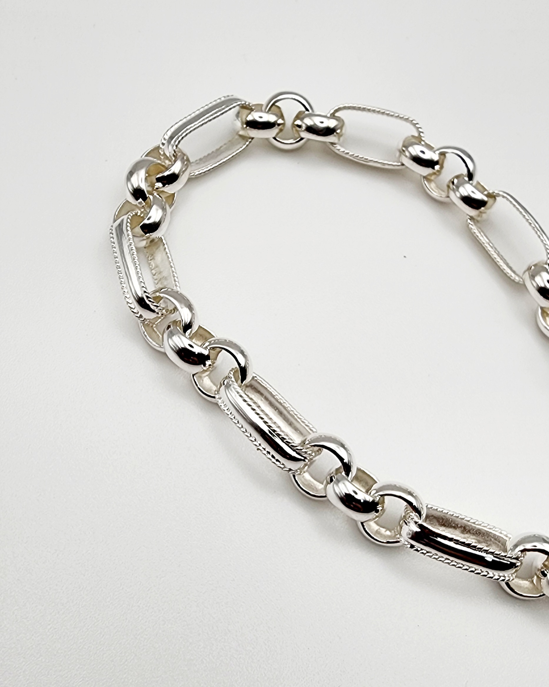 Sterling silver Figaro-style belcher link bracelet featuring a puff heart padlock charm. The puff heart padlock measures 16mm in width, adding an elegant and timeless centerpiece. The bracelet consists of alternating links: solid round belcher links measuring 8mm and oval links that are 14mm in length, both with a width of 3.5mm. Designed for security and style, the bracelet is equipped with a functional safety chain for added peace of mind.