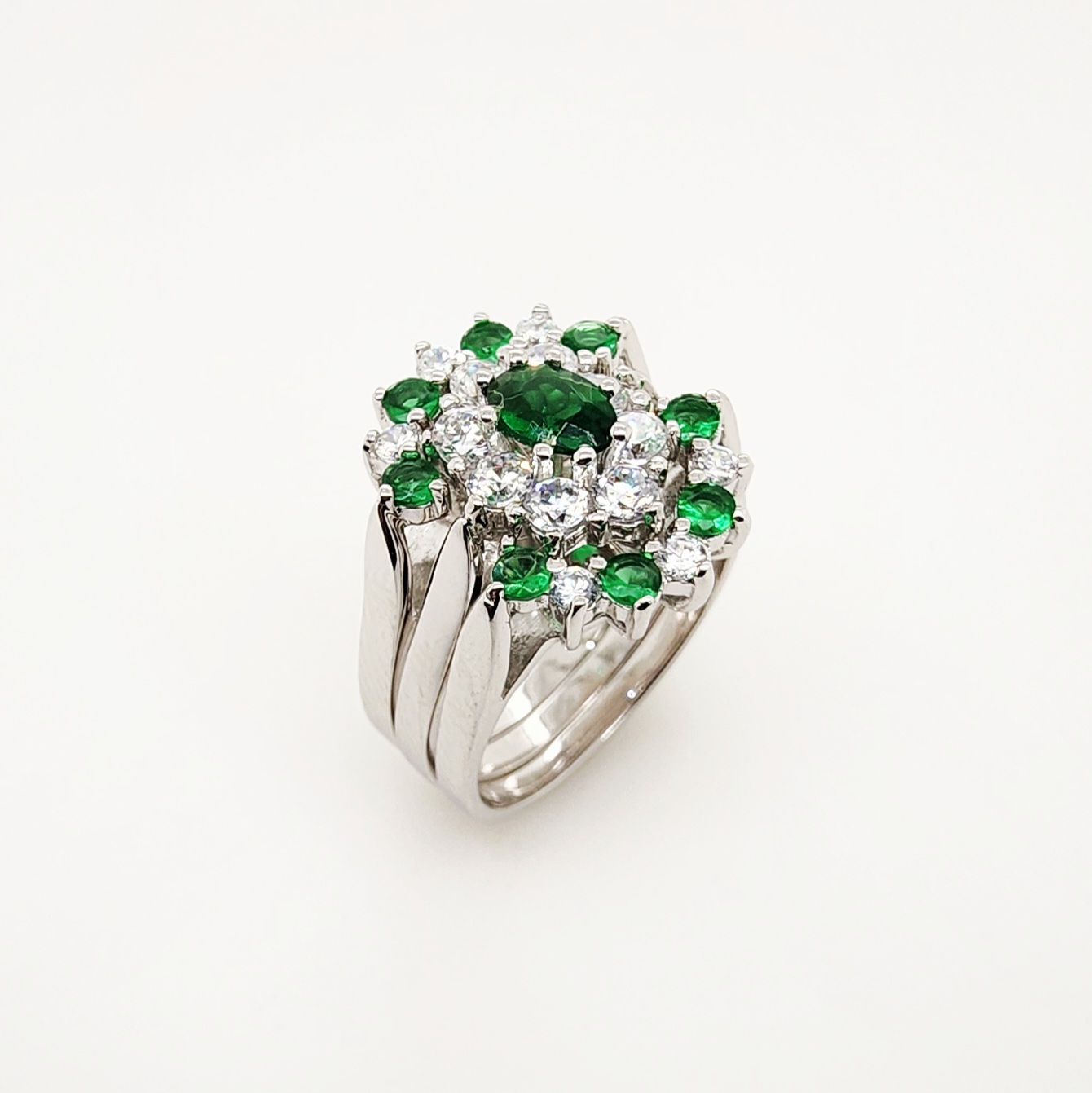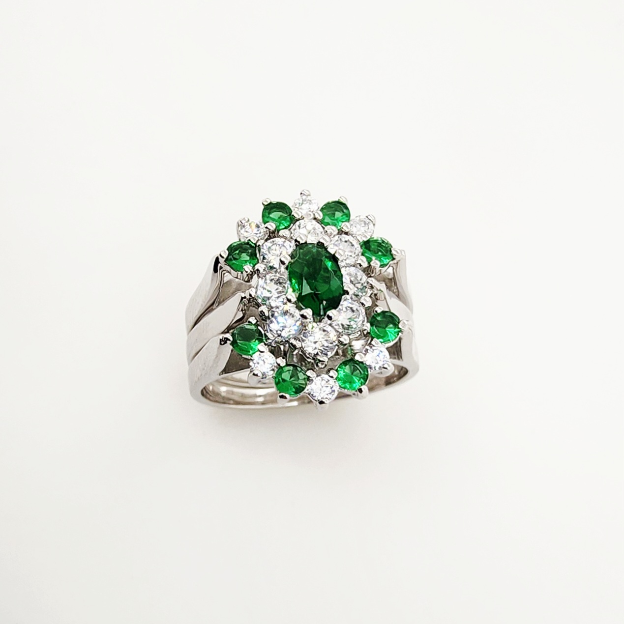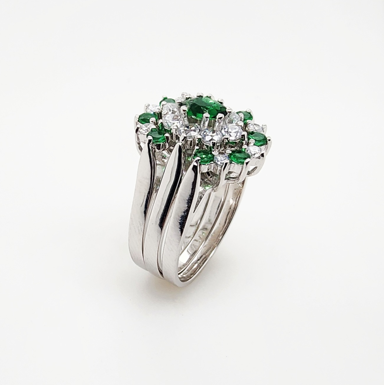 Sterling Silver 3 Piece Cluster Ring Set with Cubic Zirconia & Created Emerald Setting – R005CZGRN