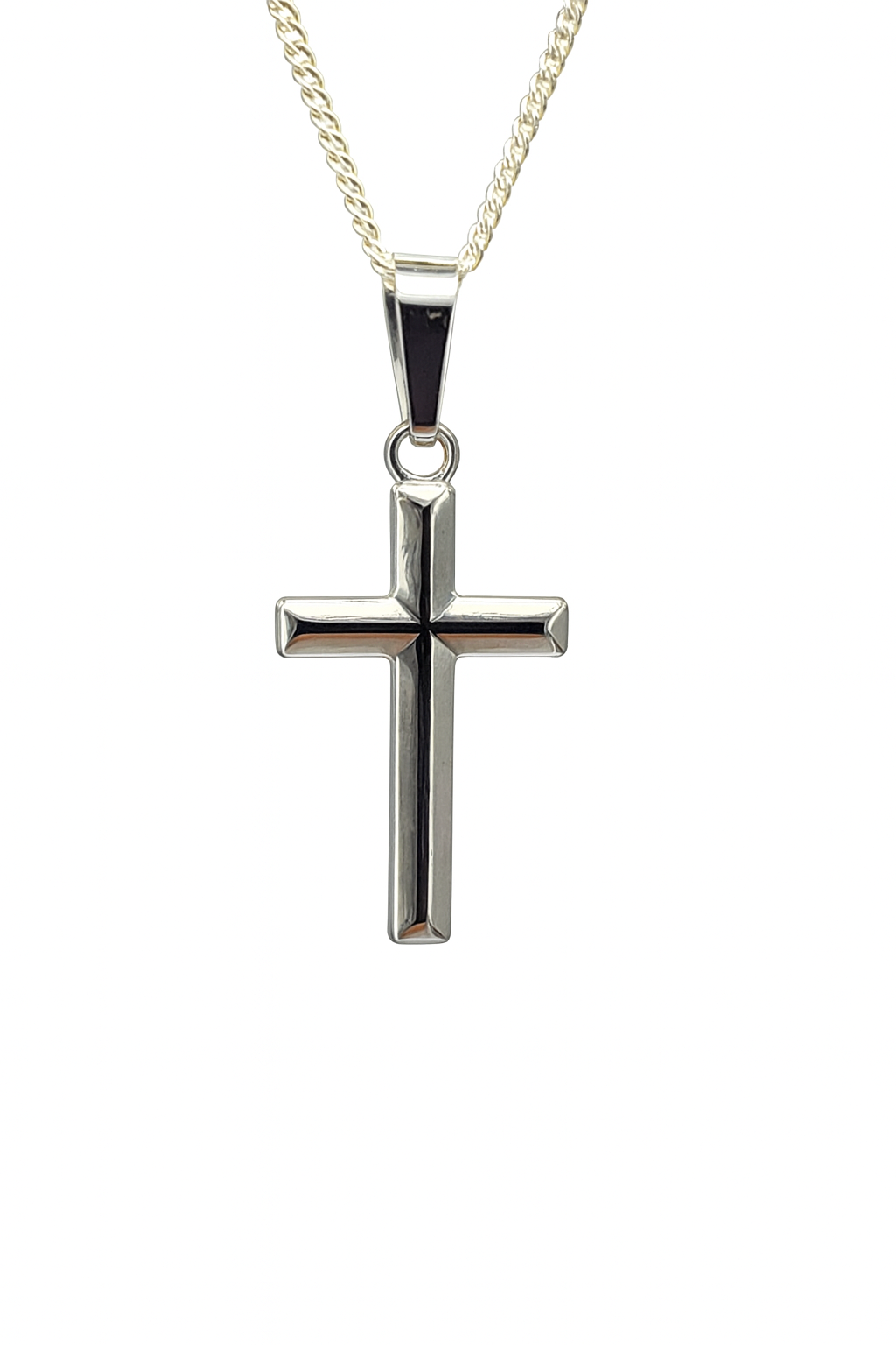This beautifully crafted sterling silver cross pendant features a sleek, modern design with sharp beveled edges and a high-polished finish that reflects light elegantly. Its clean lines make it a timeless and versatile piece suitable for both men and women. Measuring 13mm wide by 30mm high including the bale, this pendant comes complete with a complimentary sterling silver chain — a classic symbol of faith and style.