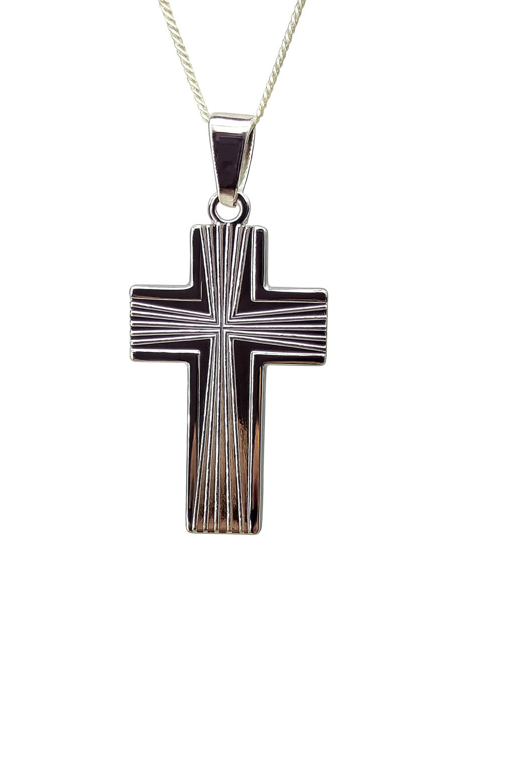 This bold sterling silver cross pendant features a striking engraved line design across the front, creating a radiant starburst effect that adds depth and dimension. Finished with a high-polished shine, this pendant beautifully combines modern craftsmanship with timeless symbolism. Measuring 30mm wide by 59mm high including the bale, it comes complete with a complimentary sterling silver chain — a distinctive and meaningful piece of jewellery.