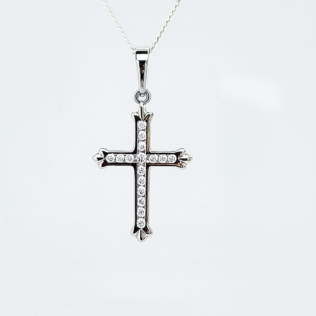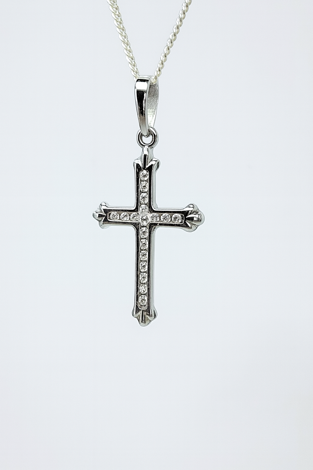 Beautifully crafted in sterling silver, this elegant cross pendant is adorned with sparkling cubic zirconia stones, adding a radiant touch to a timeless design. The detailed pointed edges enhance its classic look, while the high-polished finish ensures a brilliant shine from every angle. Measuring 15mm wide by 29mm high (including bale), this pendant comes complete with a complimentary sterling silver chain — a meaningful and stylish piece perfect for any occasion.