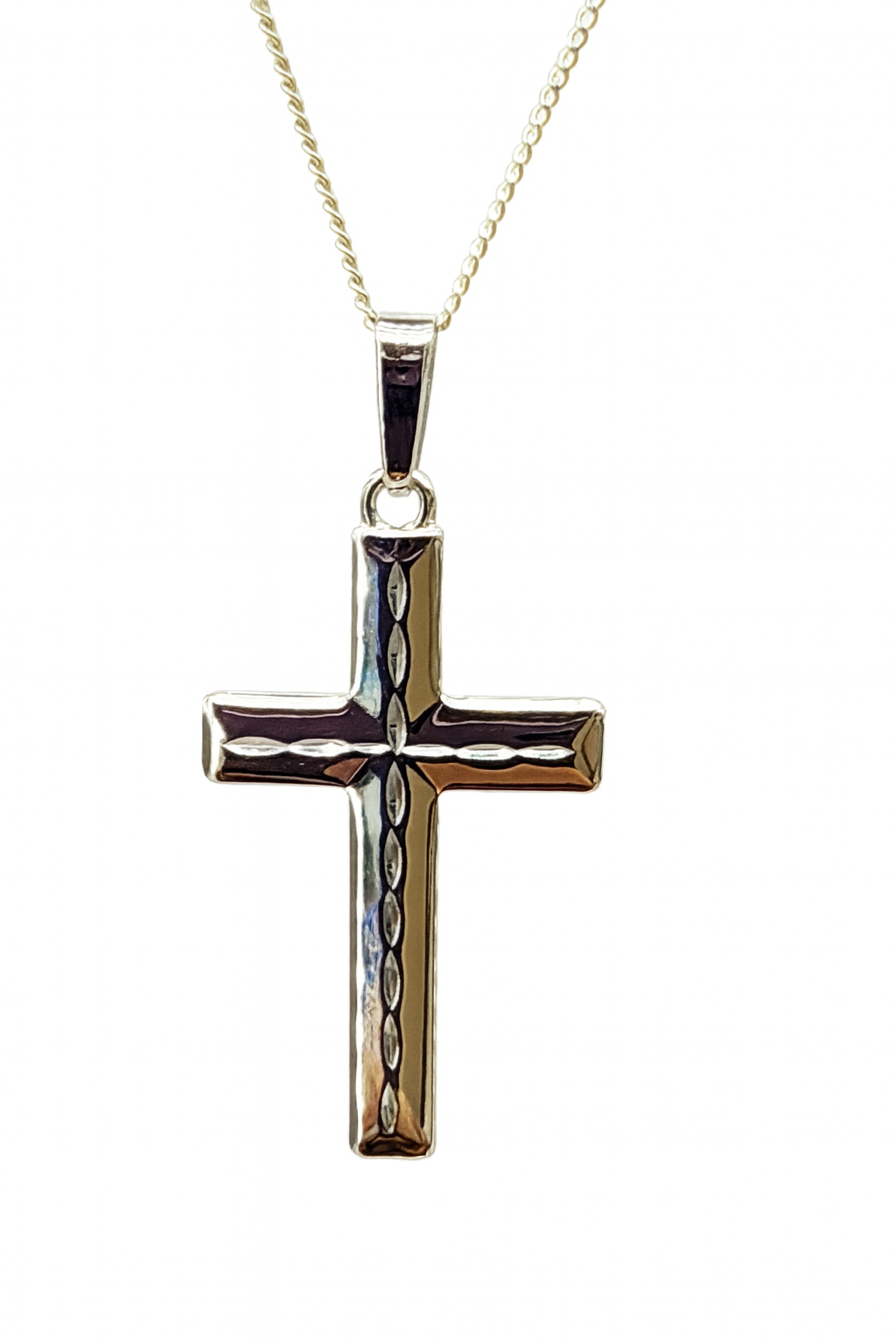 This elegant sterling silver cross pendant features a sleek high-polished finish with a fine engraved pattern running through the centre, adding subtle texture and detail. Beautifully crafted for a timeless and refined look, the pendant measures 20mm wide by 40mm high including the bale. Complete with a complimentary sterling silver chain, this piece makes a meaningful and stylish addition to any jewellery collection.