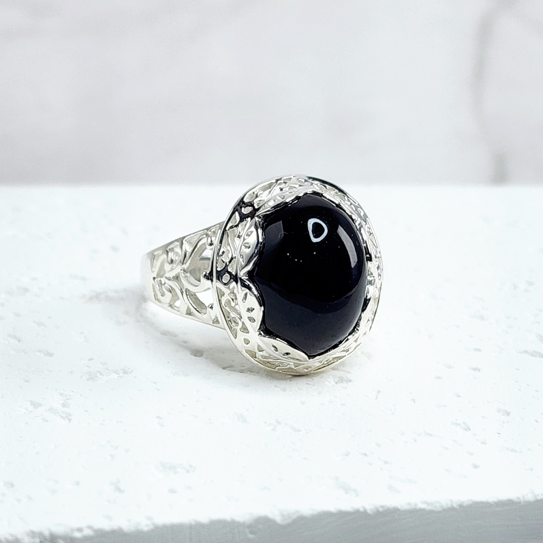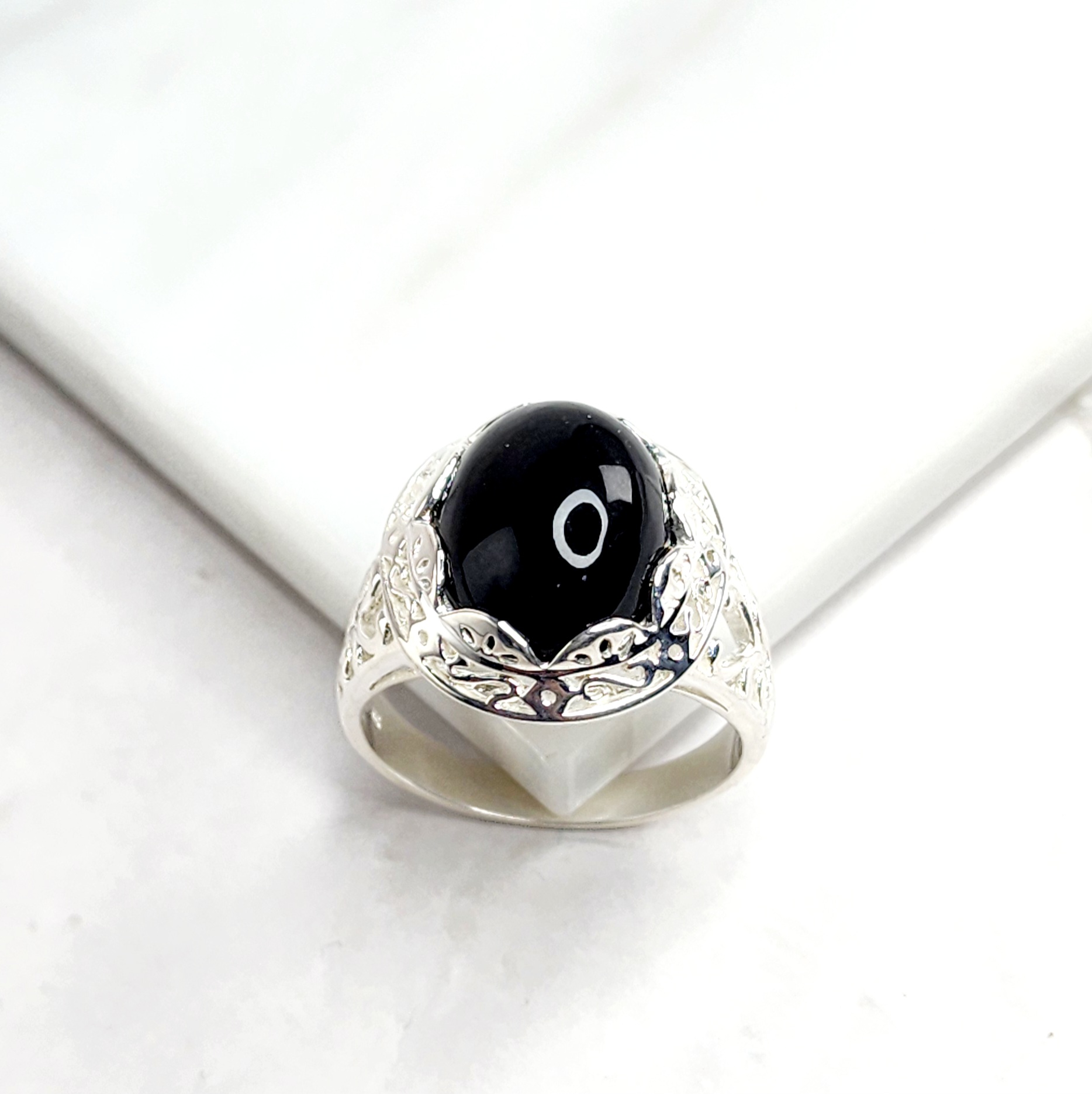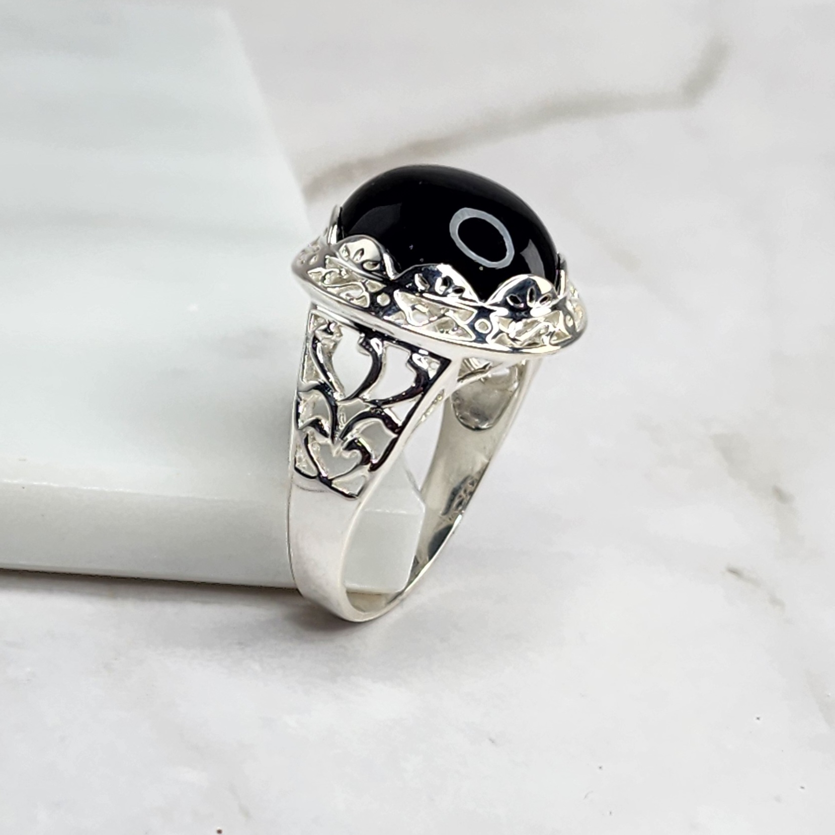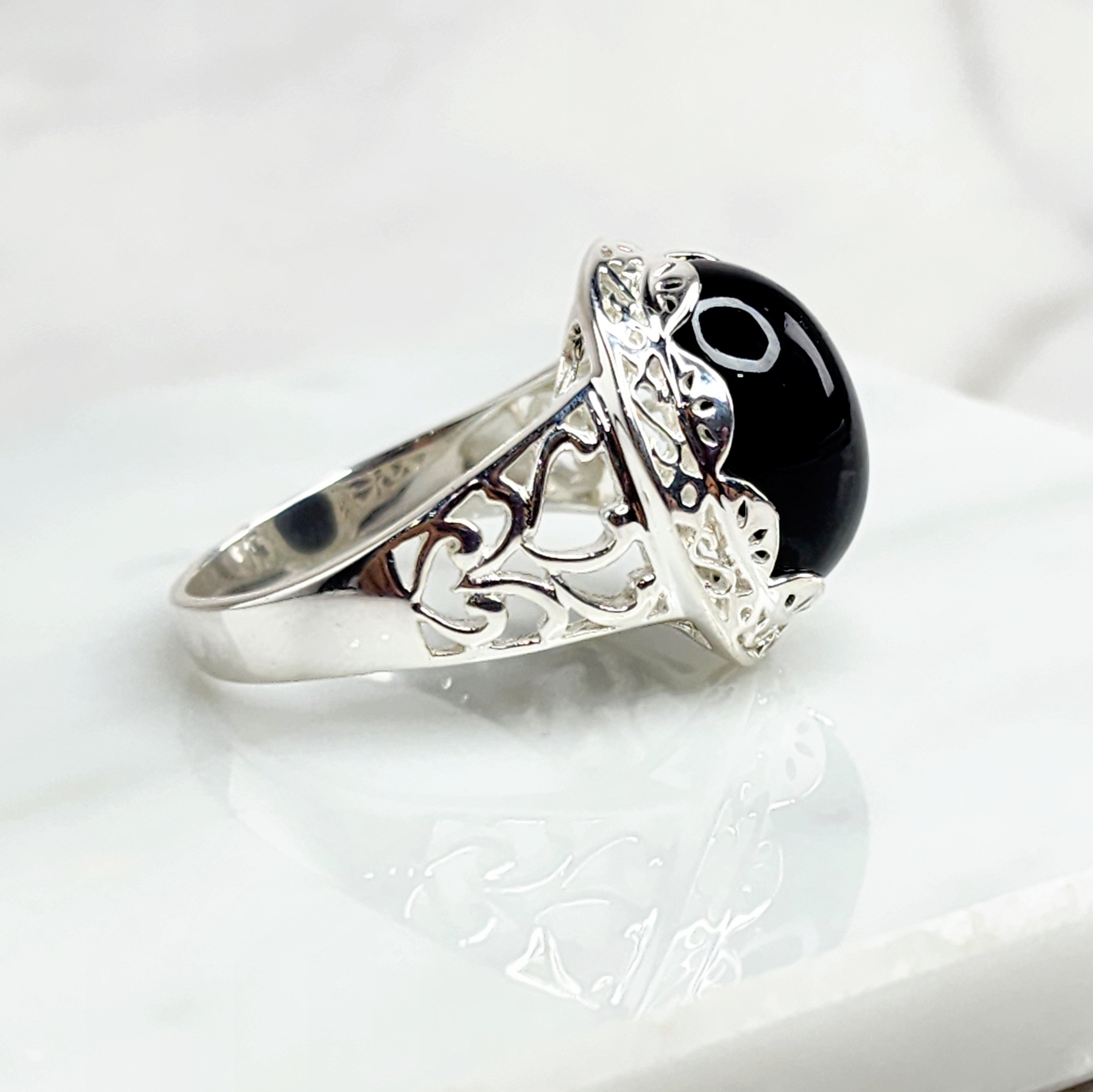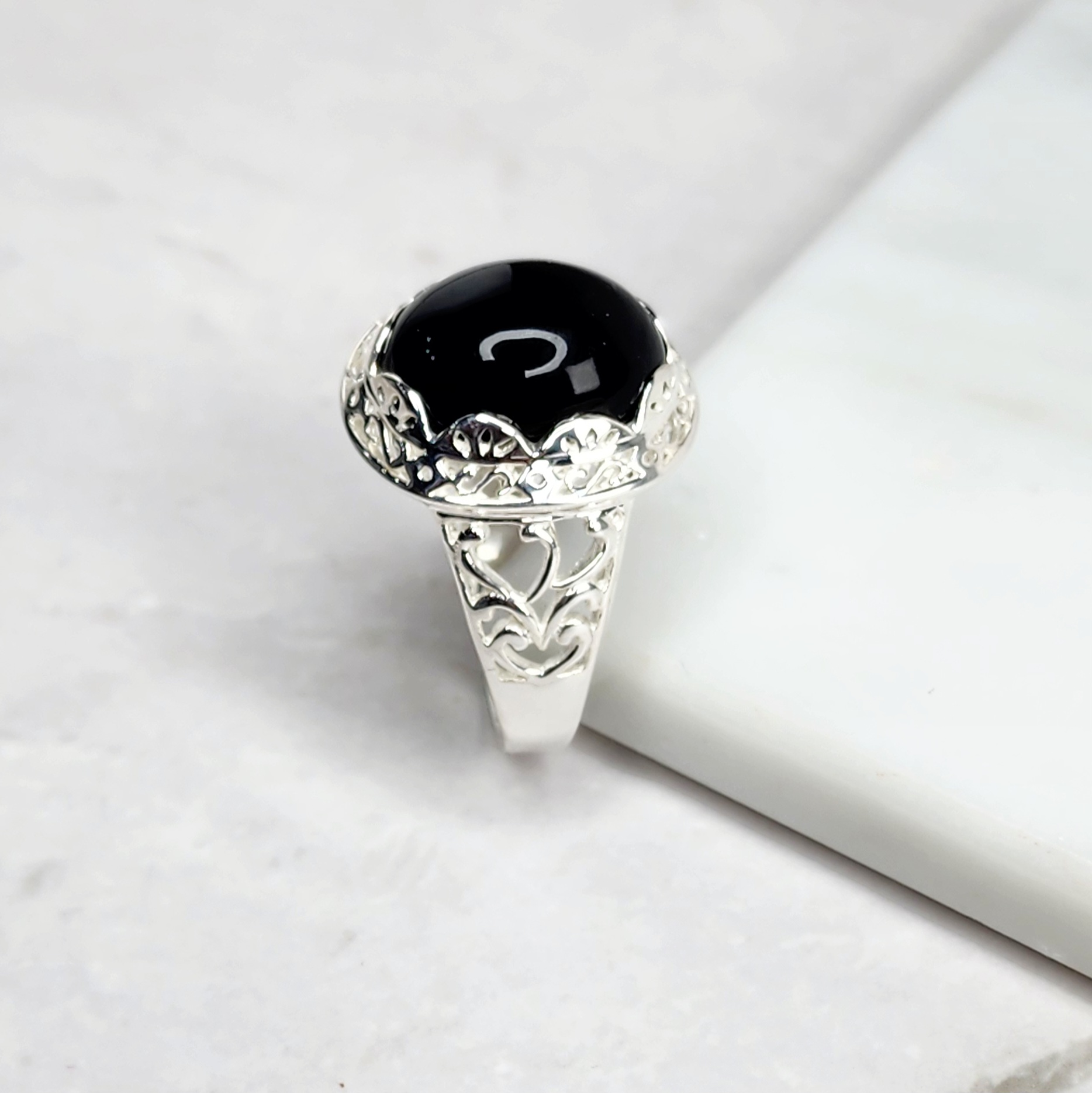 Sterling Silver Filigree Design Ring with Oval Black ONYX