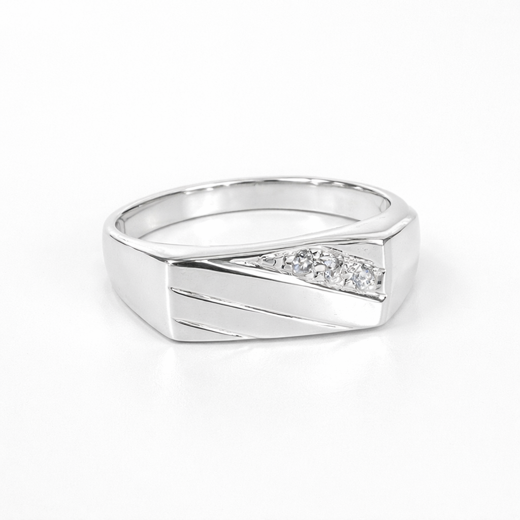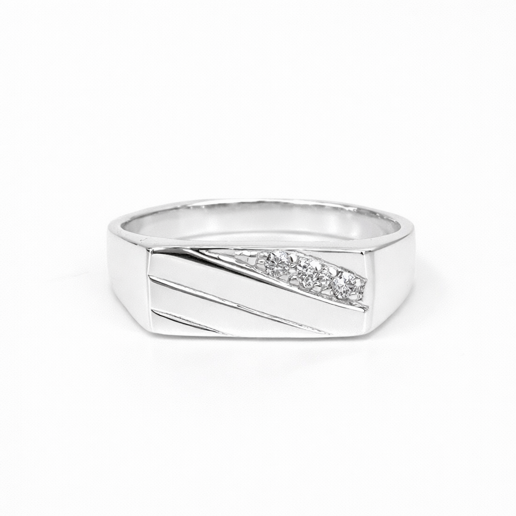 Adding to the architectural style, four engraved diagonal lines sweep across the top, creating depth and movement. The CZ stones are positioned between two of the engraved lines, drawing the eye to the centre detail and giving the ring a strong, contemporary finish.