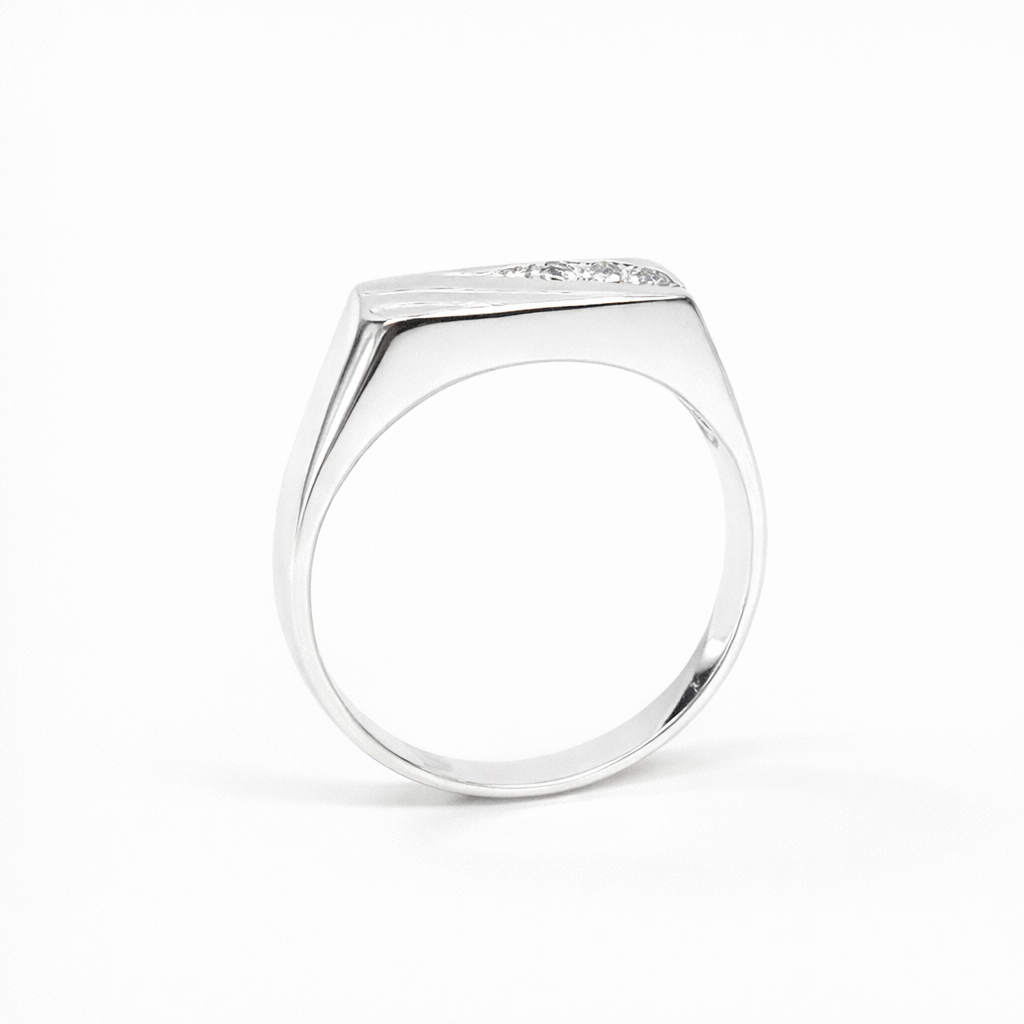 Crafted in sleek sterling silver, this gents signet ring features a modern rectangular top measuring 14mm (W) x 6mm (H), delivering a bold yet refined look on the hand. The face is styled with a sharp angled motif and set with three round cubic zirconia (CZ) stones, designed to catch the light and add a clean, sophisticated sparkle while keeping the overall look understated and masculine.