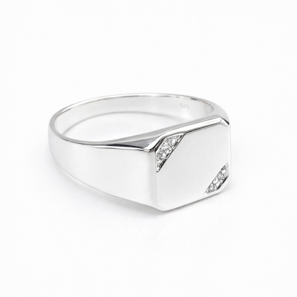 The ring features a bold, flat signet face measuring 10.90mm x 11.50mm, polished to a smooth mirror finish for a sharp, modern look. Accenting the design is a sparkling cubic zirconia (CZ), securely 4-claw set to add refined brilliance without overpowering the ring’s strong silhouette.