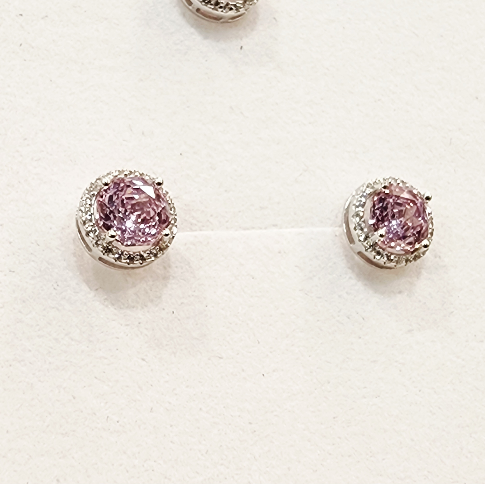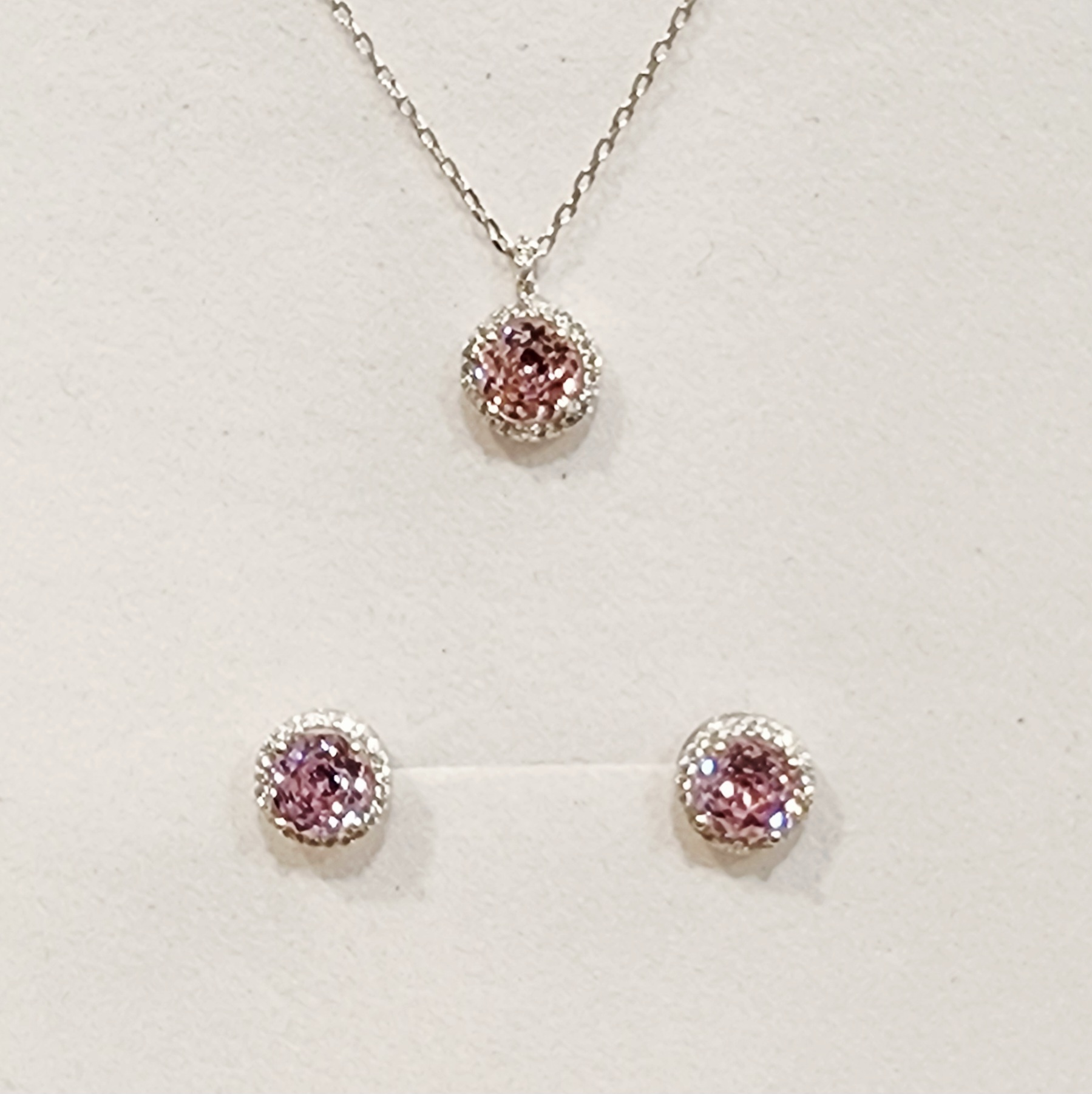 The matching stud earrings mirror the pendant’s design. Each earring measures 8.50mm round, featuring a luminous light pink cubic zirconia as the central stone, surrounded by a radiant halo of clear cubic zirconias. The stones are precision-set in sterling silver, ensuring both durability and brilliance.