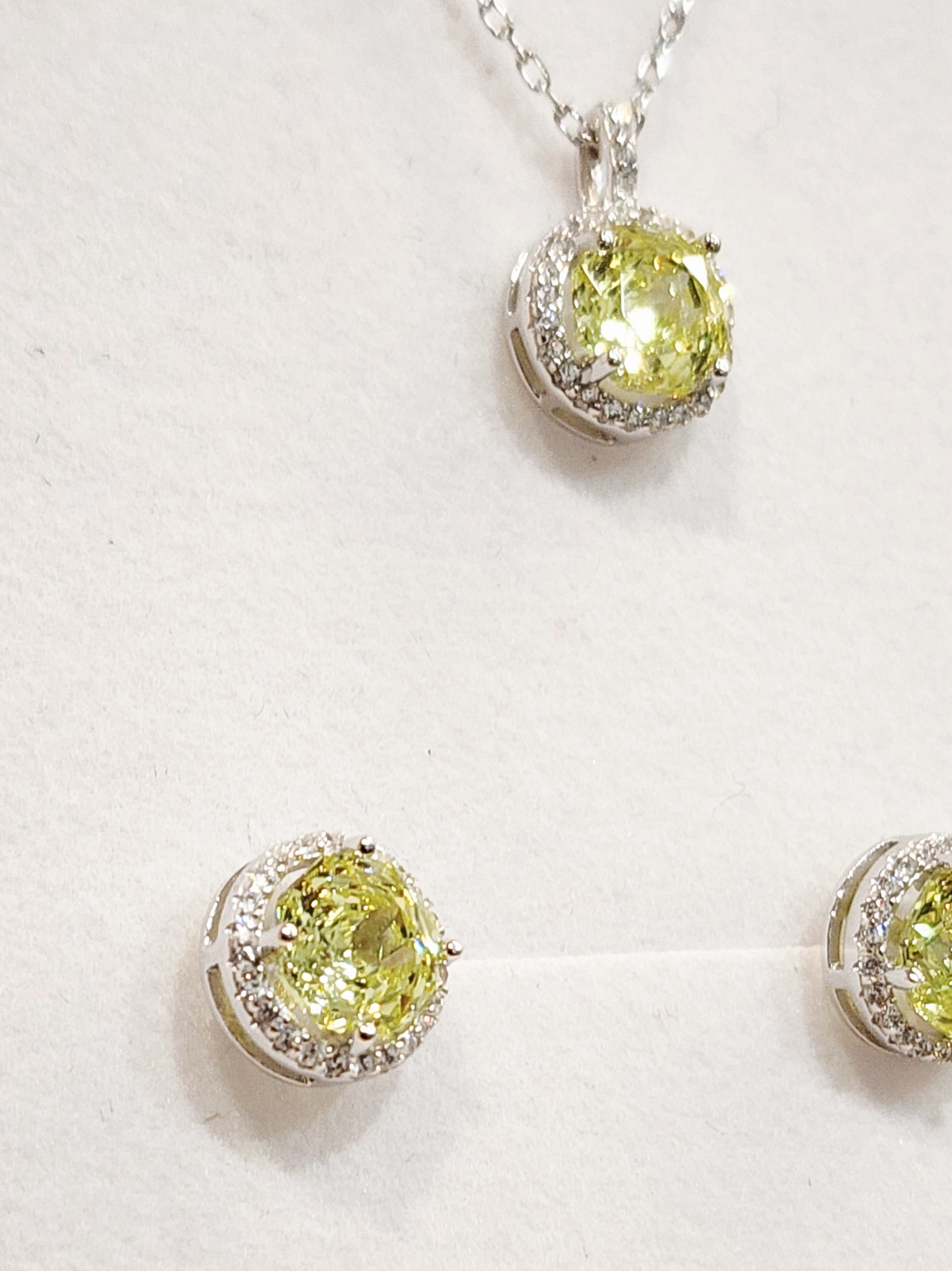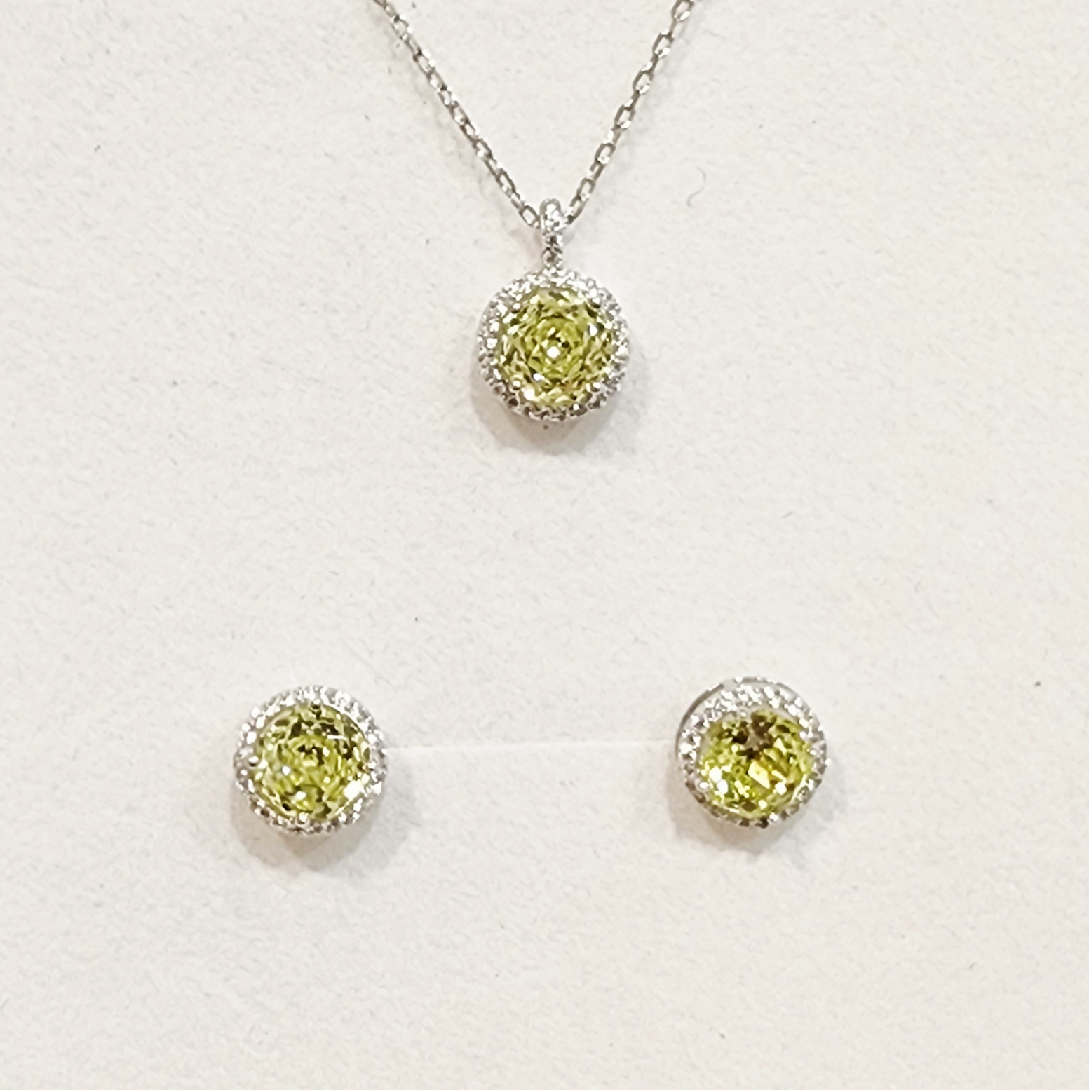 The matching stud earrings mirror the pendant’s design, each measuring 8.50mm round. At the heart of each earring lies a striking peridot-coloured cubic zirconia, framed by a dazzling halo of clear cubic zirconias, all set in secure claw settings for maximum shine and durability.