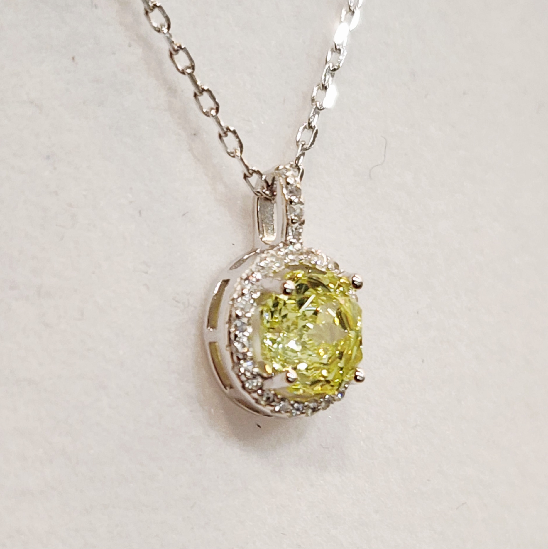 The pendant measures 12.40mm in height by 8.50mm in width and is set with a brilliant 6mm round peridot-coloured cubic zirconia at its centre, securely held in a classic claw setting. Surrounding the centre stone is a radiant halo of clear cubic zirconias, adding extra brilliance and enhancing the vivid green hue. For added elegance, the bale is also embellished with sparkling clear CZ stones. The pendant comes complete with a complimentary sterling silver chain, ready to wear or gift.