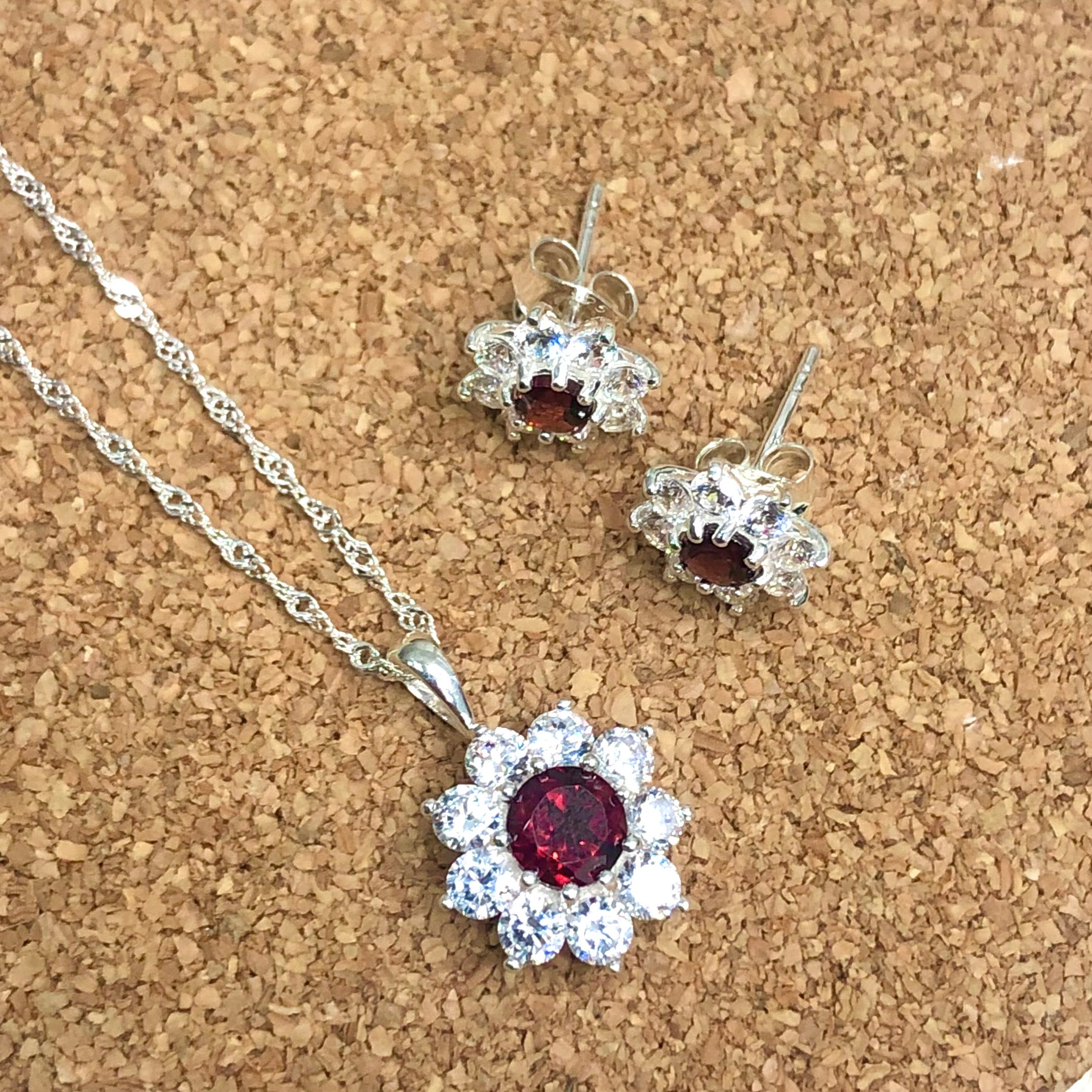 Sterling Silver Halo Solitaire?Created Ruby & CZ Pendant and Earring Set