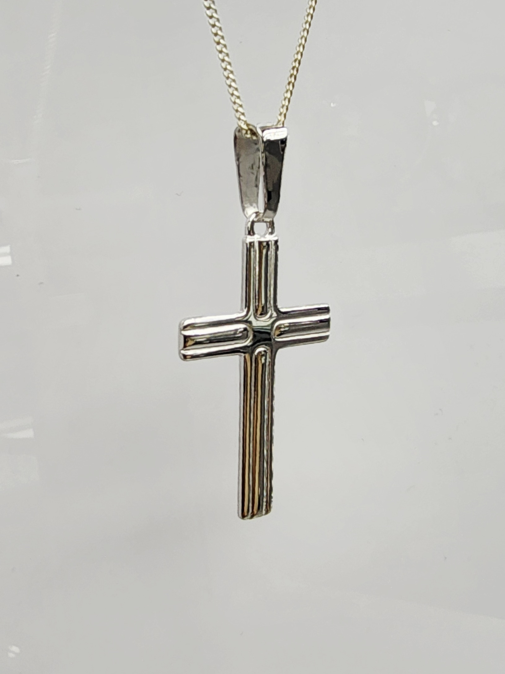 Crafted from solid sterling silver, this beautifully designed cross pendant features a sleek high-polished finish with a subtle double-line detail through the centre, giving it a refined and elegant look. Measuring 20mm wide by 43mm high including the bale, this pendant is paired with a complimentary sterling silver chain, making it a perfect symbol of faith and style — ideal for both everyday wear and special occasions.