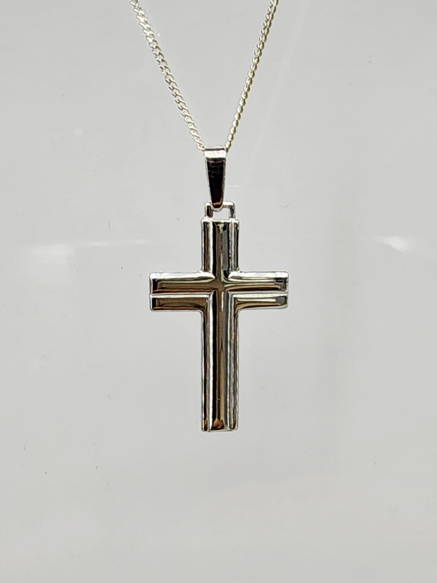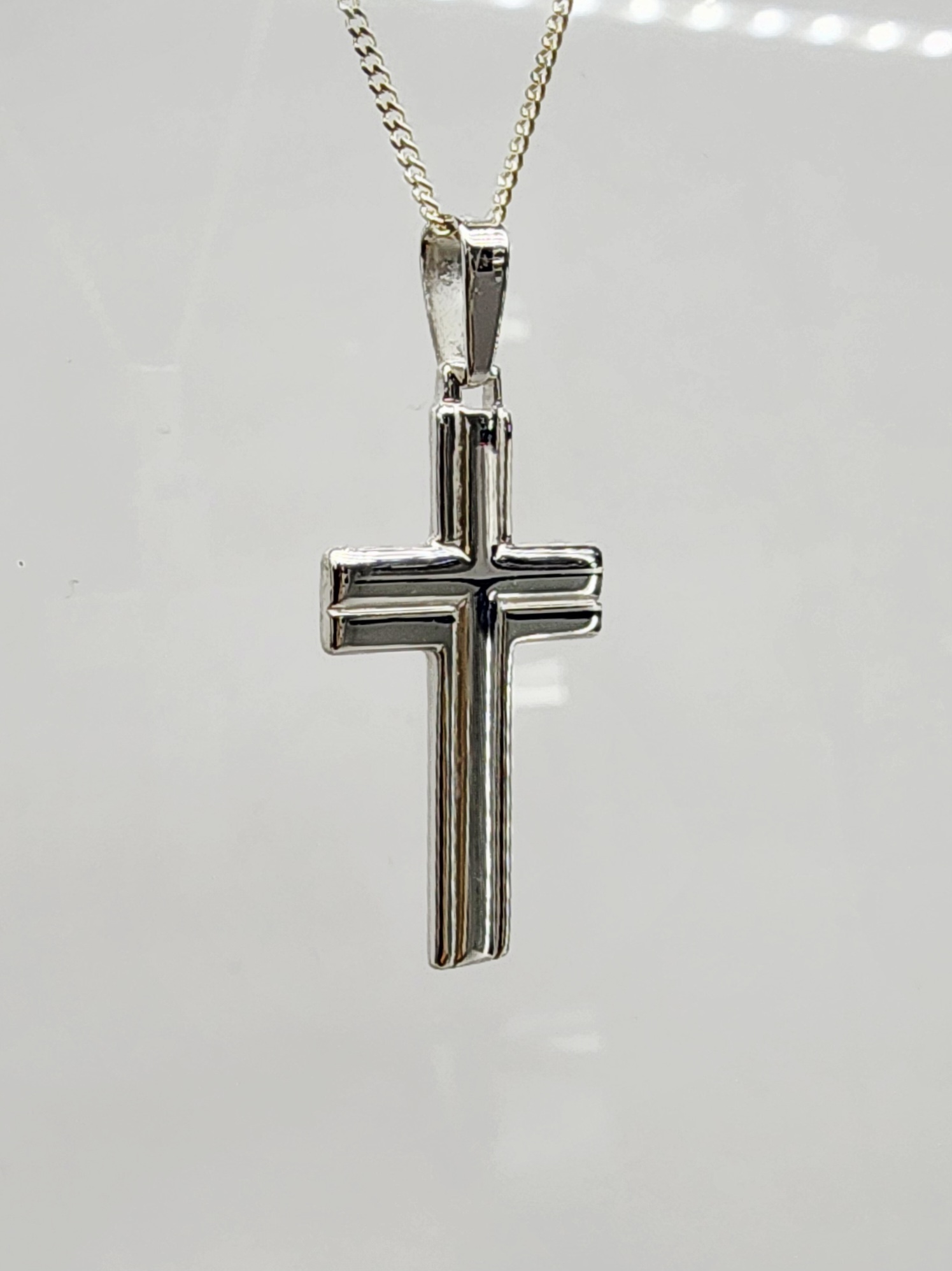 This sterling silver cross pendant features a sleek and classic design with a smooth high-polished finish and subtle groove detailing through the centre. Measuring 18mm wide by 37mm high including the bale, it comes complete with a complimentary sterling silver chain — a simple yet elegant expression of faith and