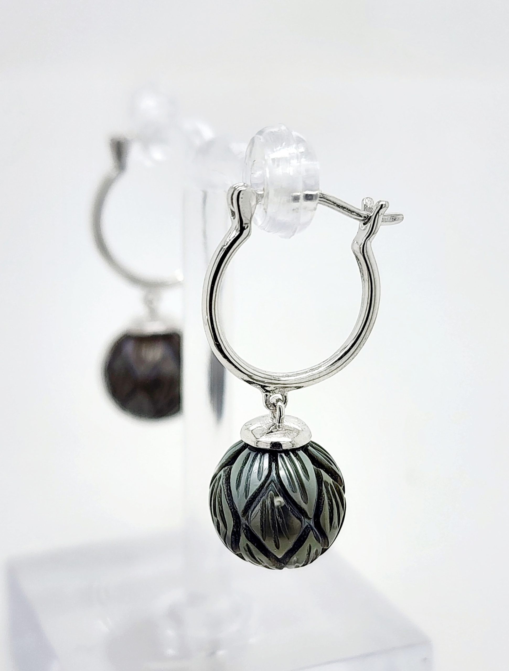 Sterling Silver Hoop Earrings with 10mm-11.00mm Hand Carved Round Tahitian Black Pearls
