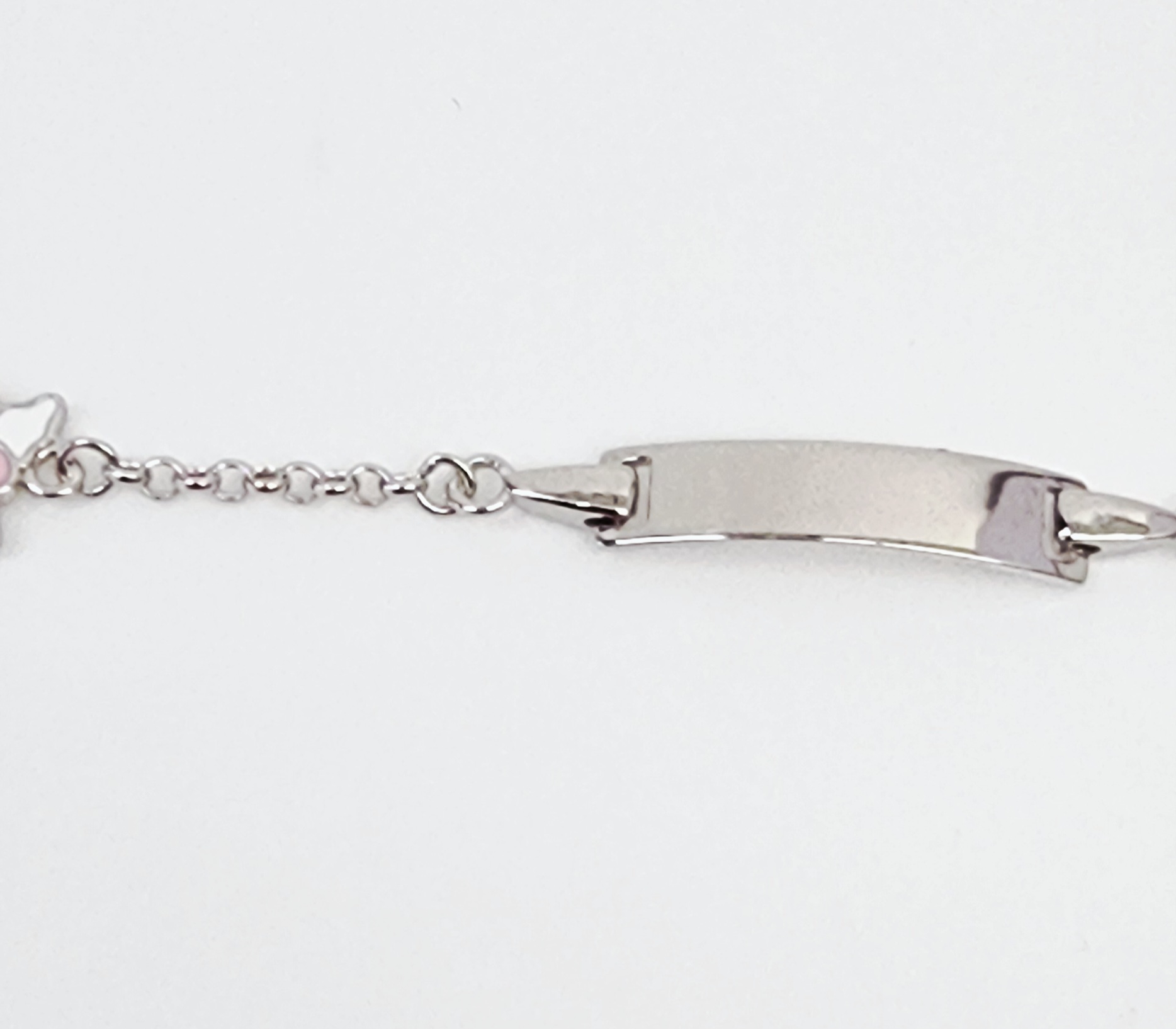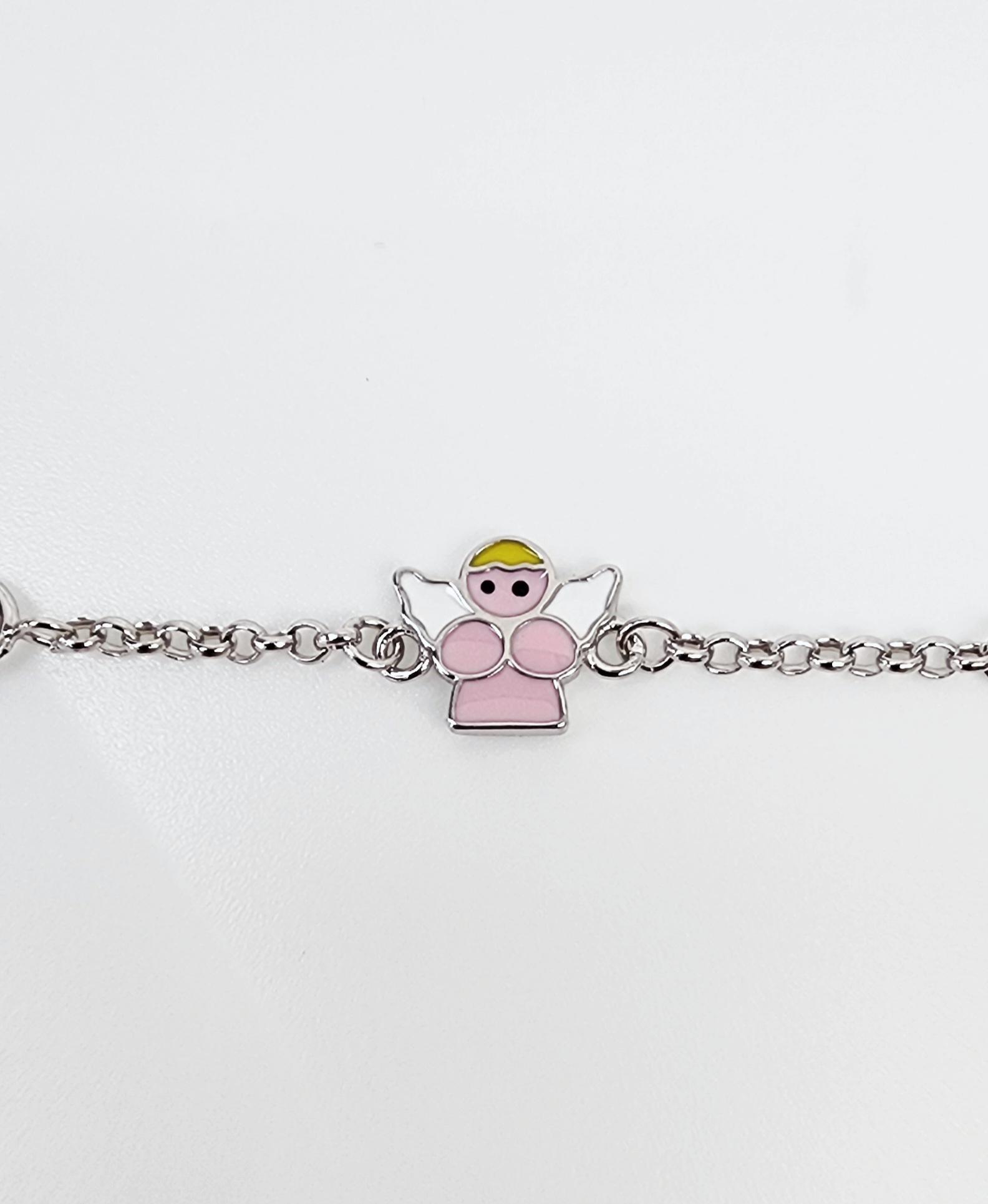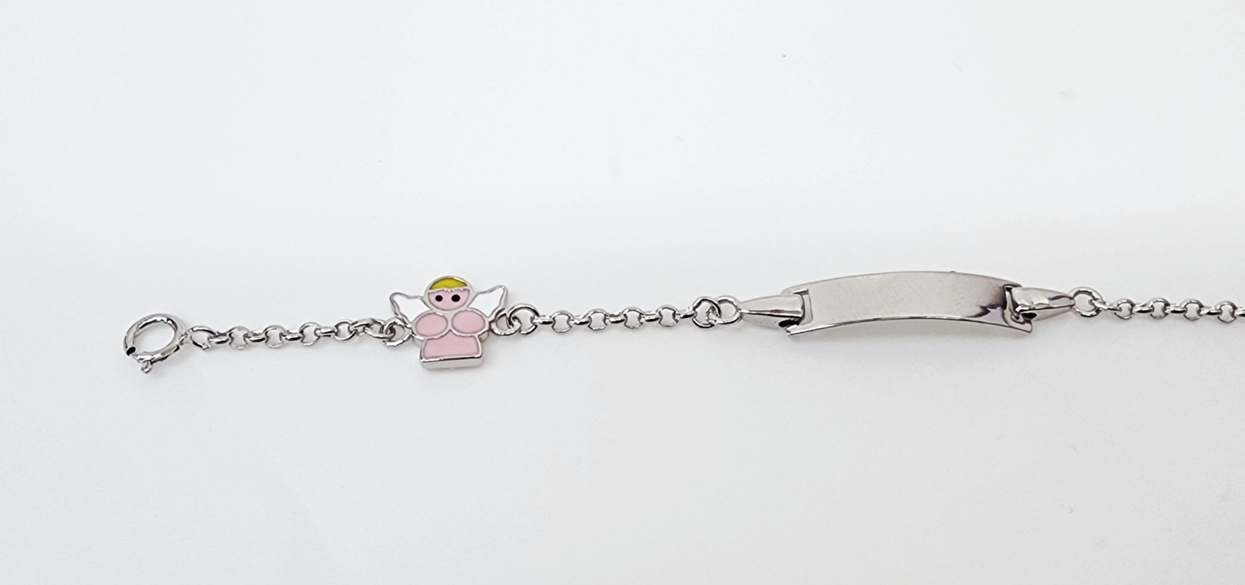 At the centre, a sleek ID plate measuring 17mm x 5mm provides space for a personal touch, such as an engraving. Adding to its playful and youthful design, the bracelet is adorned with an angel motif finished in soft pink, white, and yellow enamel, giving it a colourful, cheerful look perfect for kids.