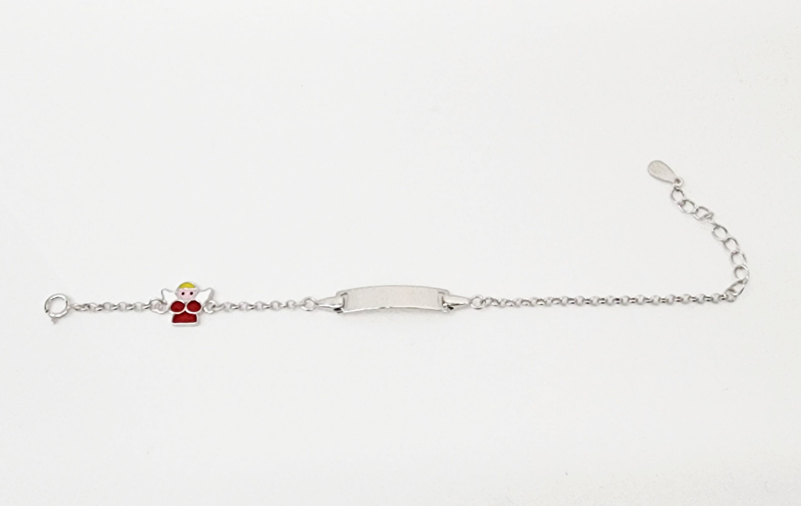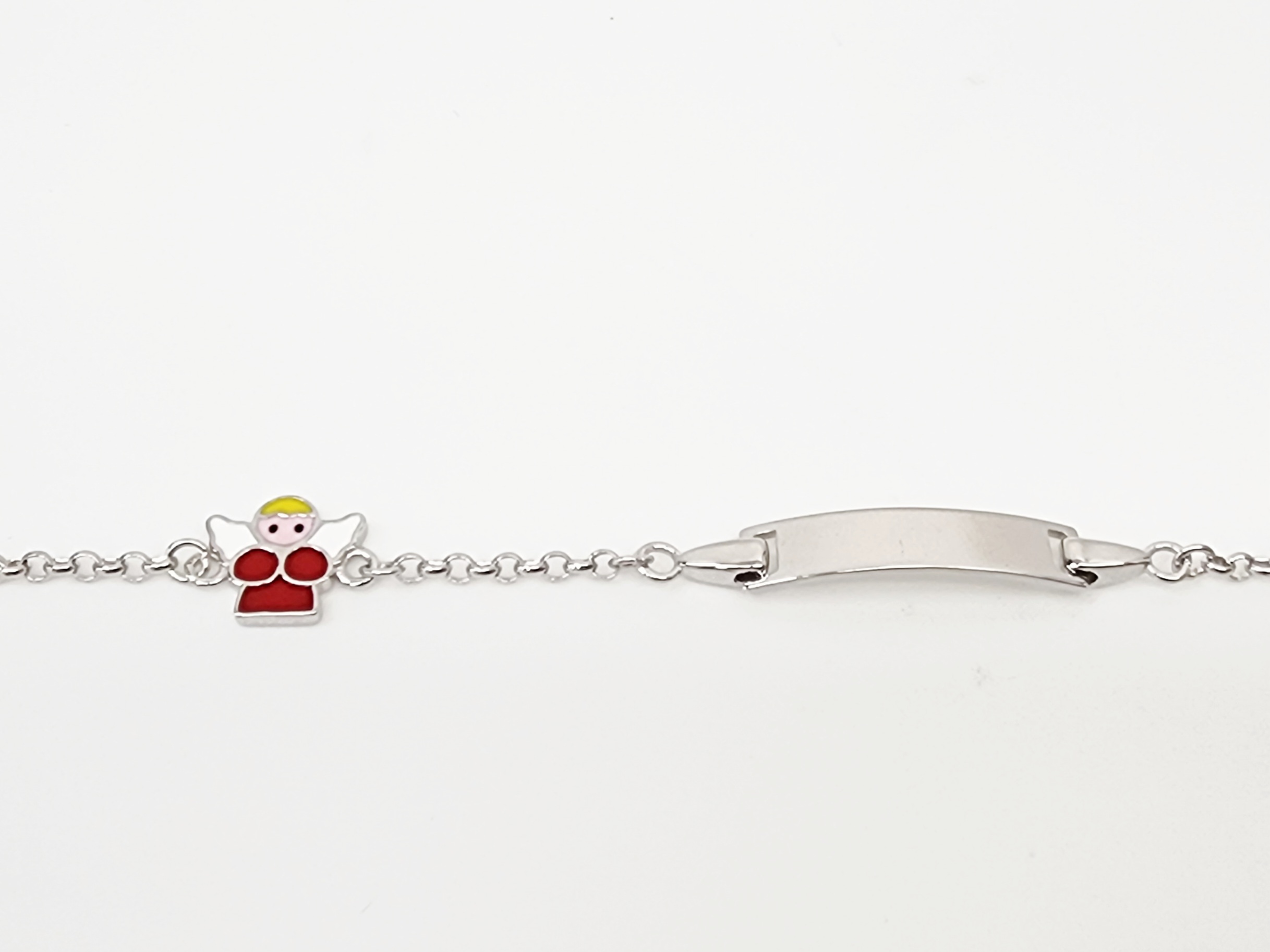 The highlight of the bracelet is its angel motif, beautifully detailed with a colourful red, white, and yellow enamel finish, adding a cheerful and vibrant look that children will adore. At the centre sits a sleek ID tag measuring 17mm x 5mm, perfect for personalising with a name or special engraving.