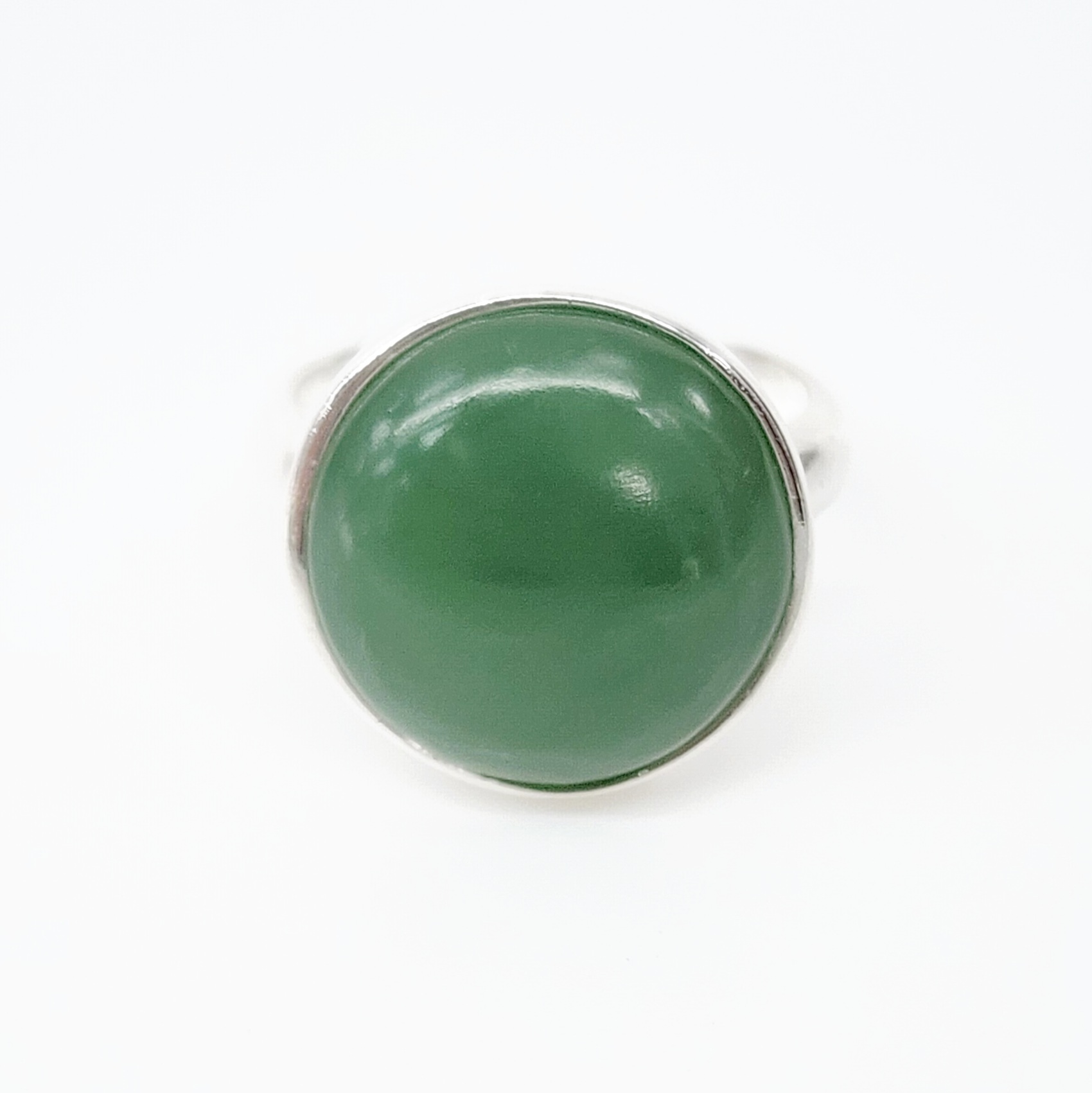 This elegant unisex dress ring is crafted in solid sterling silver and showcases a striking 17.50mm round, dome-cut New Zealand greenstone (pounamu) as its centerpiece. The greenstone is securely held in a rubover bezel setting, which features a fully covered back to protect and highlight the stone’s natural beauty.