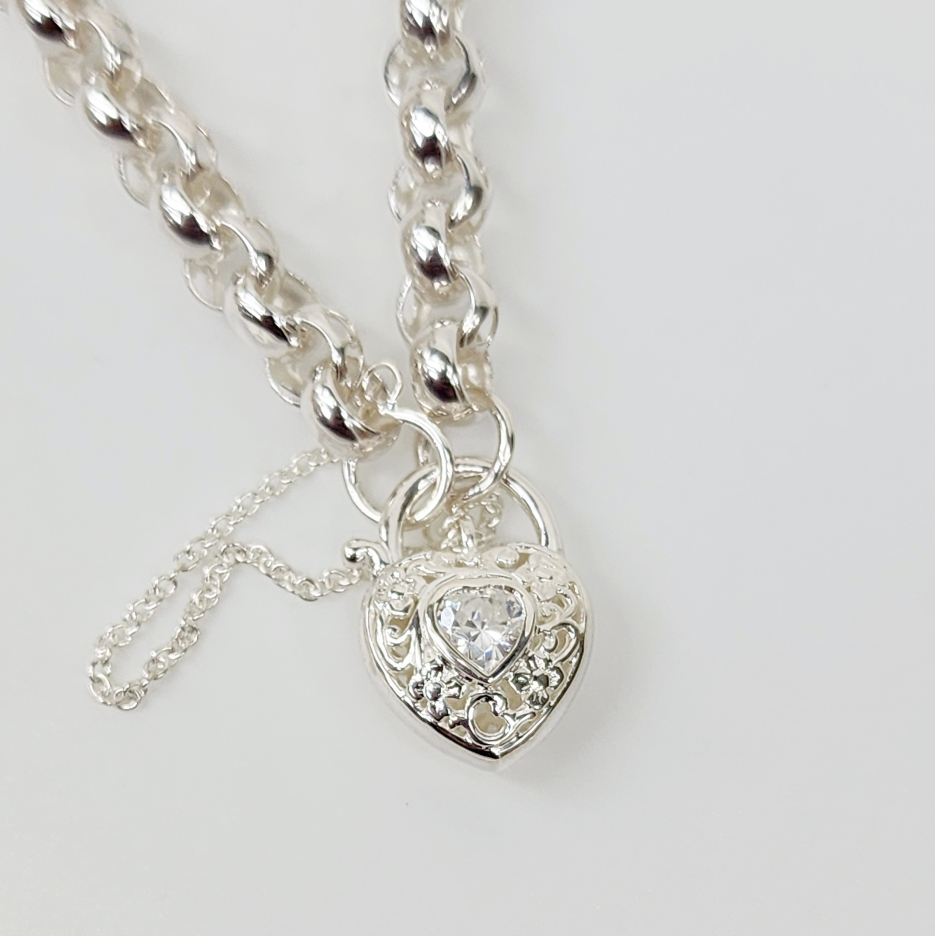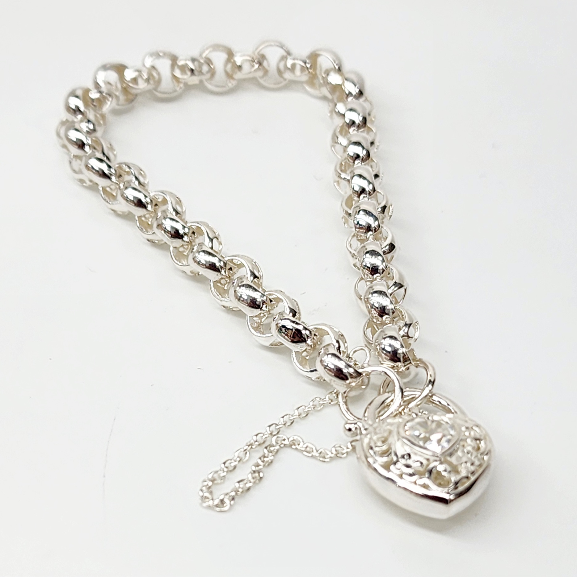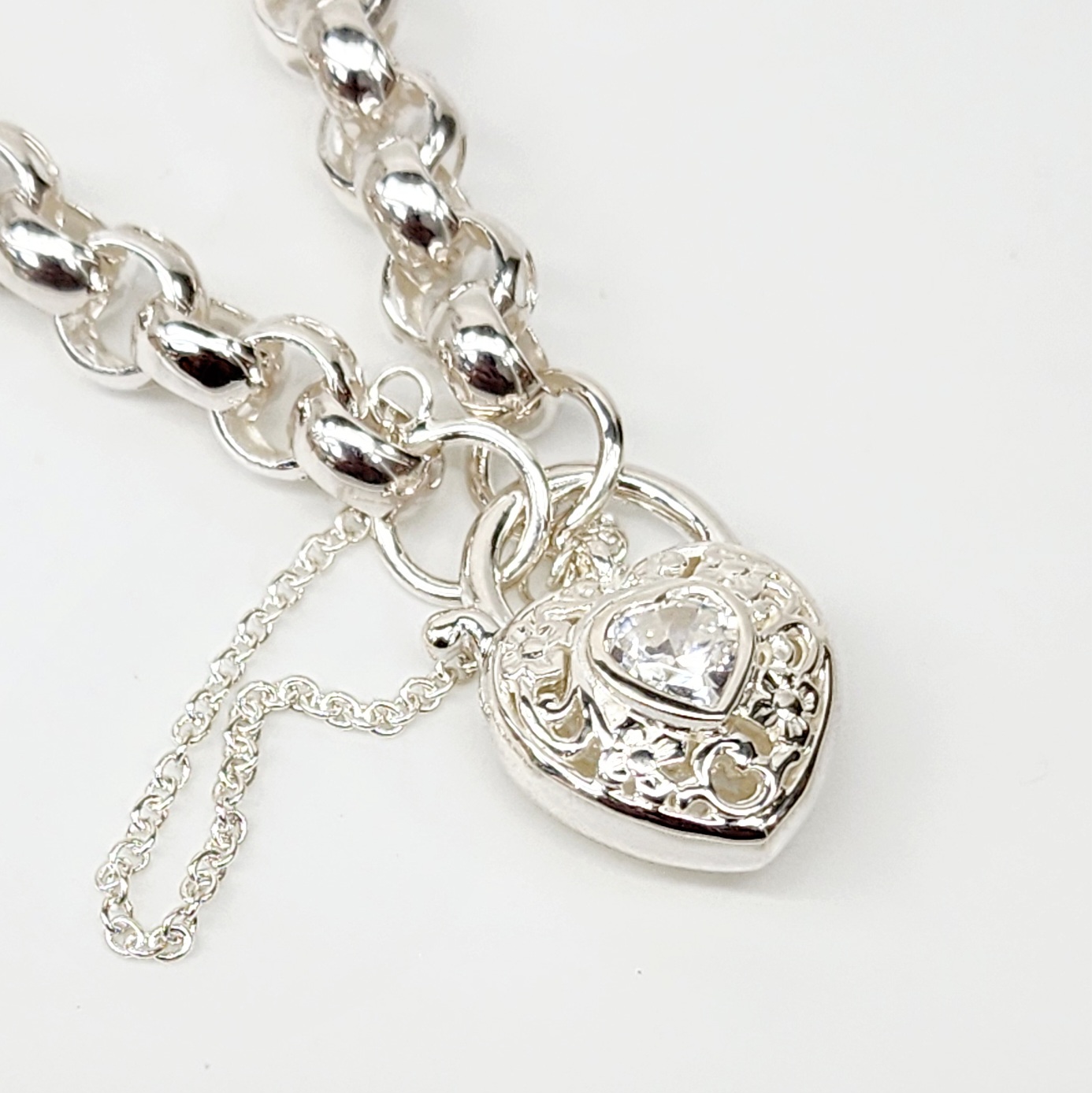 Sterling Silver Round Belcher with Heart Shape Clear CZ Filigree Padlock Bracelet