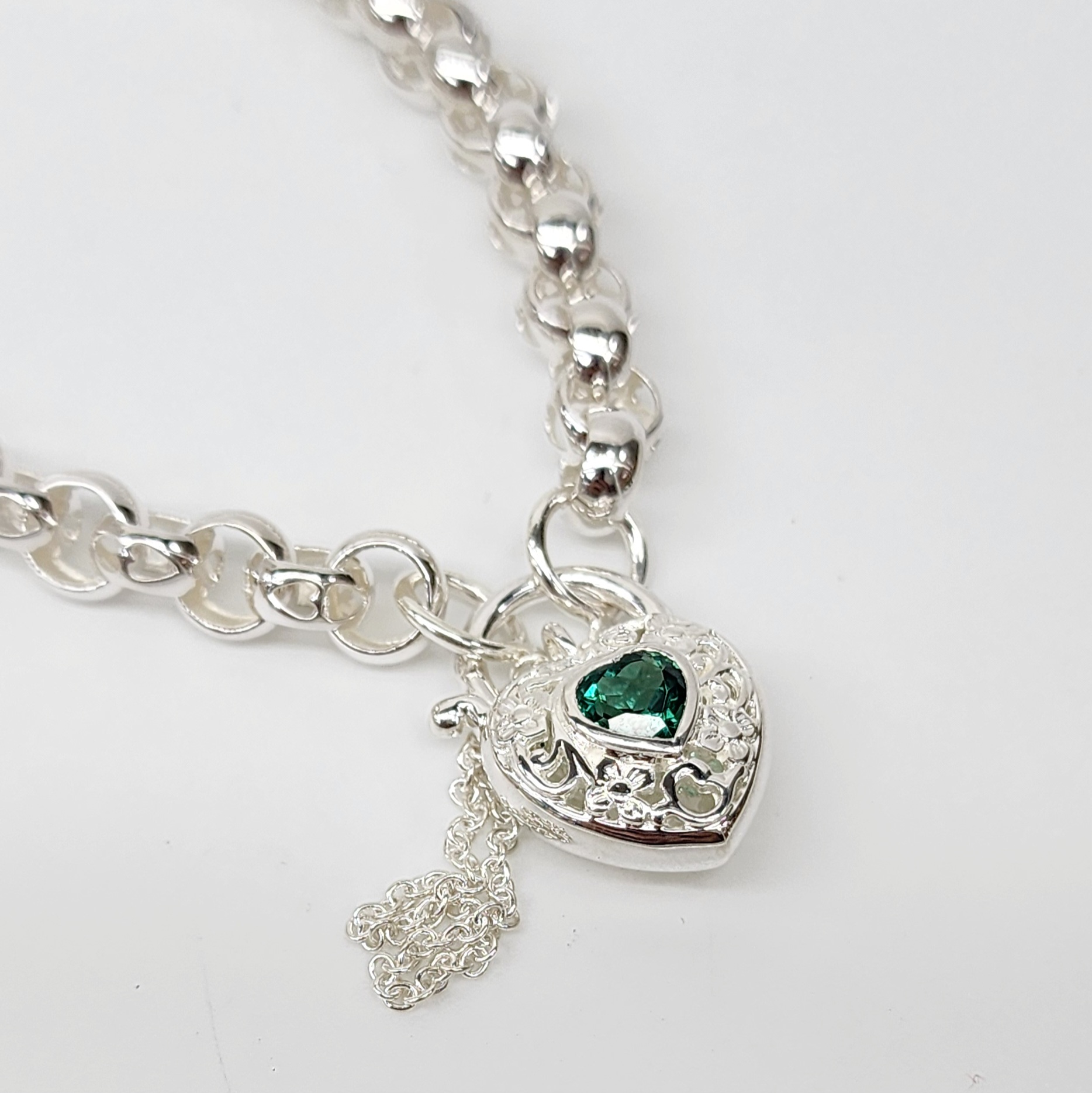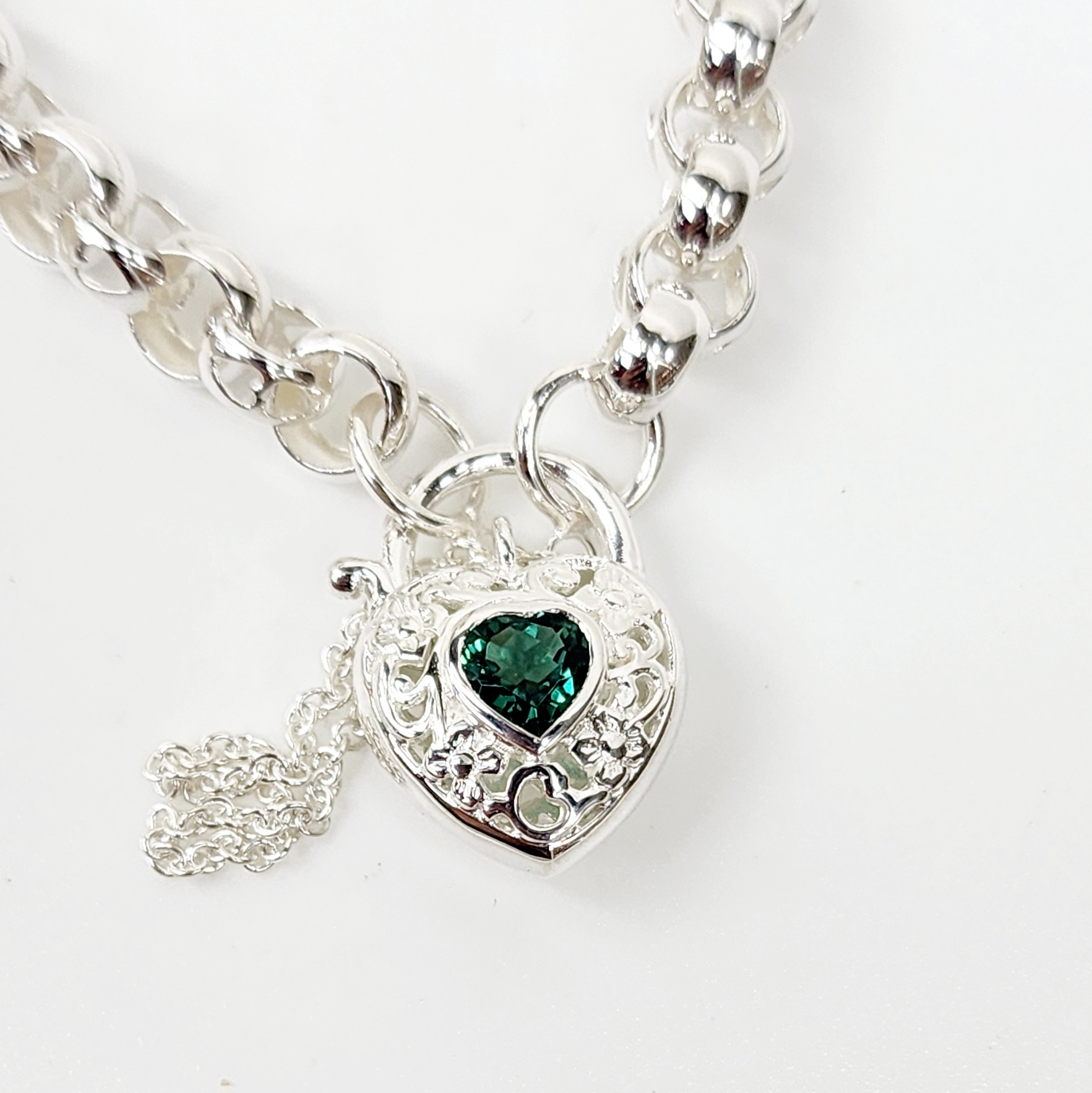 Sterling Silver Round Belcher with Heart Shape Green CZ Filigree Padlock Bracelet