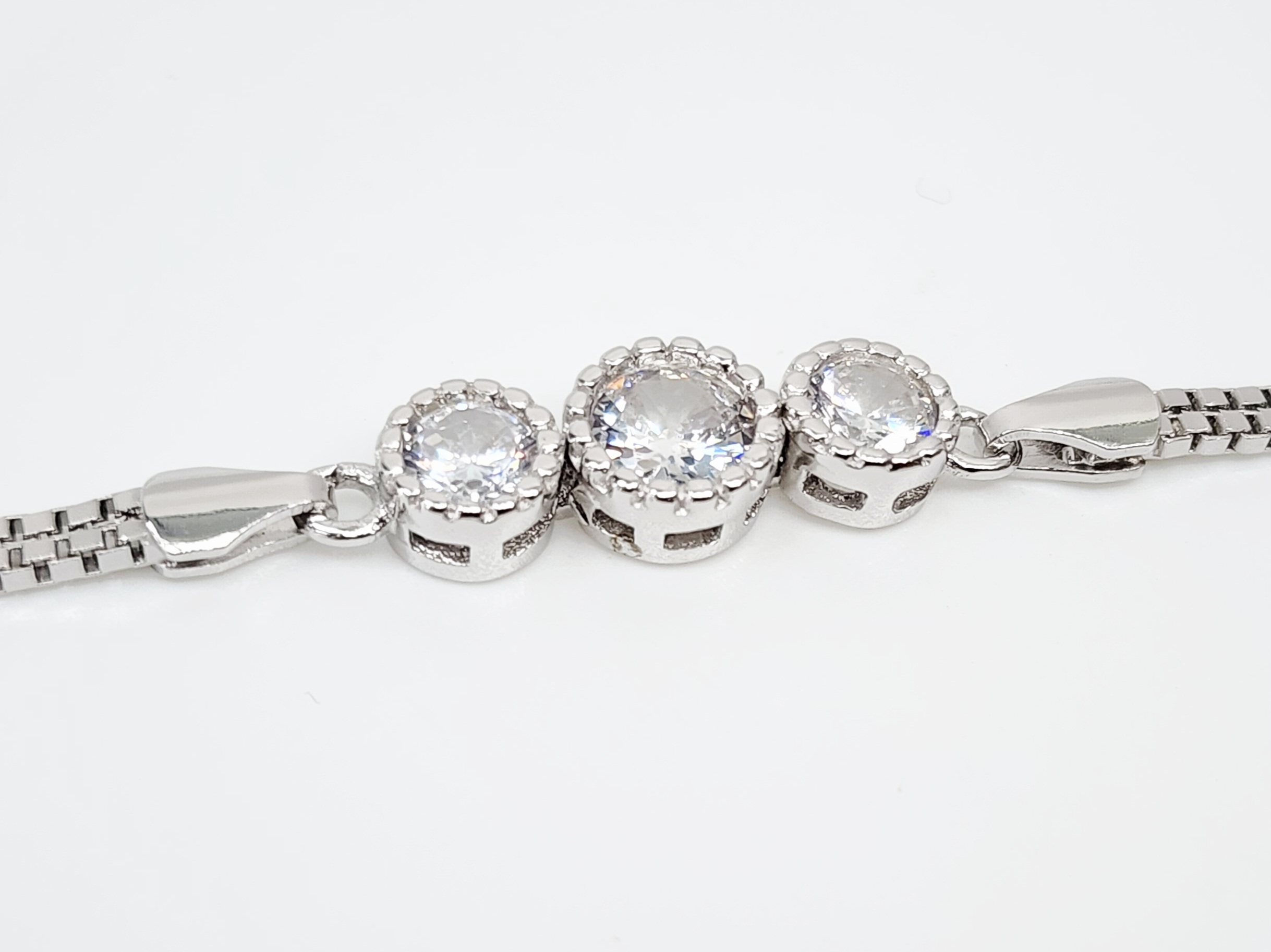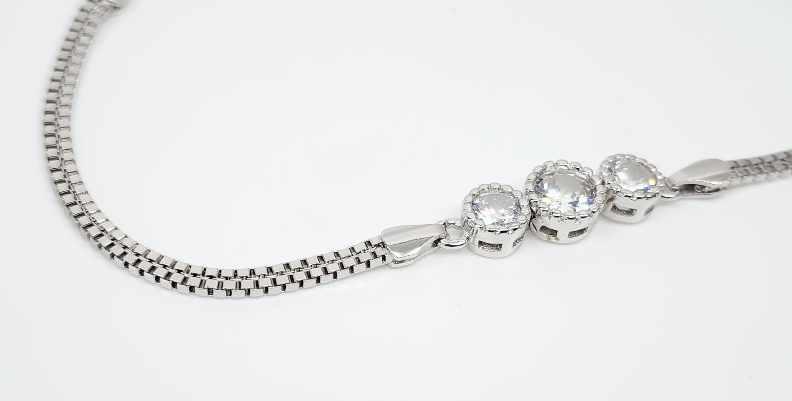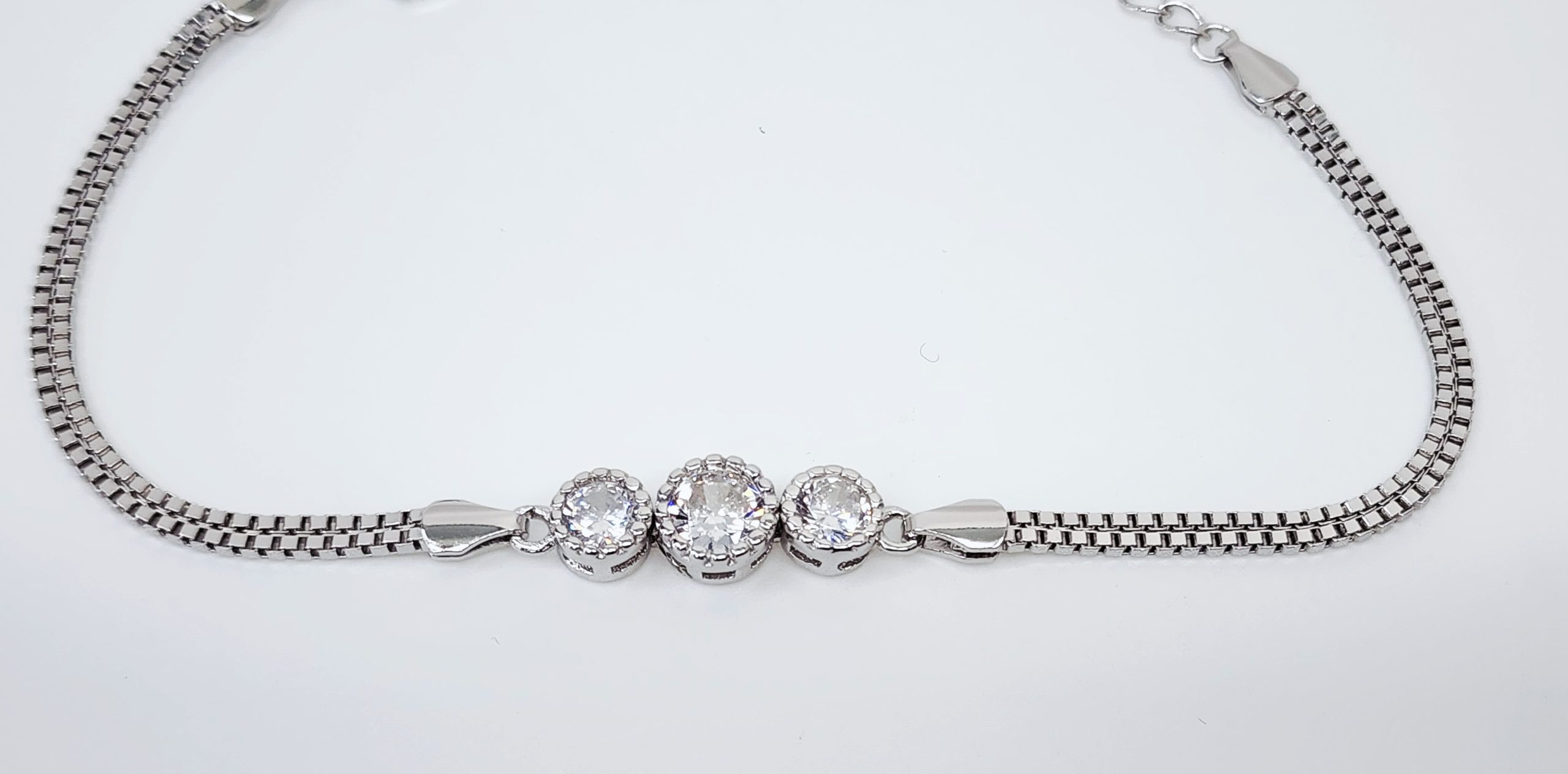 A timeless and versatile accessory, this sterling silver double box chain bracelet with three sparkling cubic zirconias is perfect for everyday elegance or as a thoughtful gift for someone special.