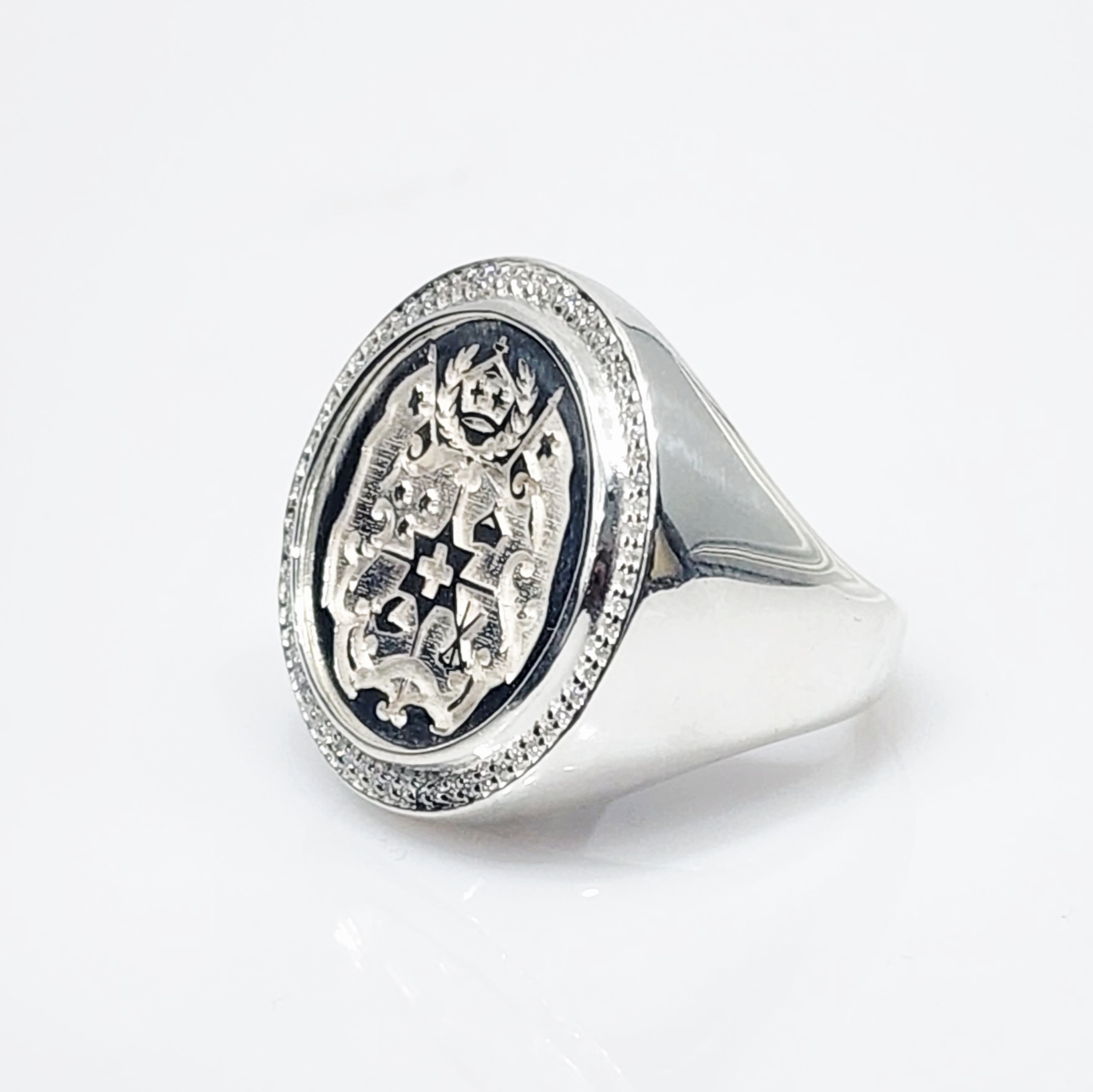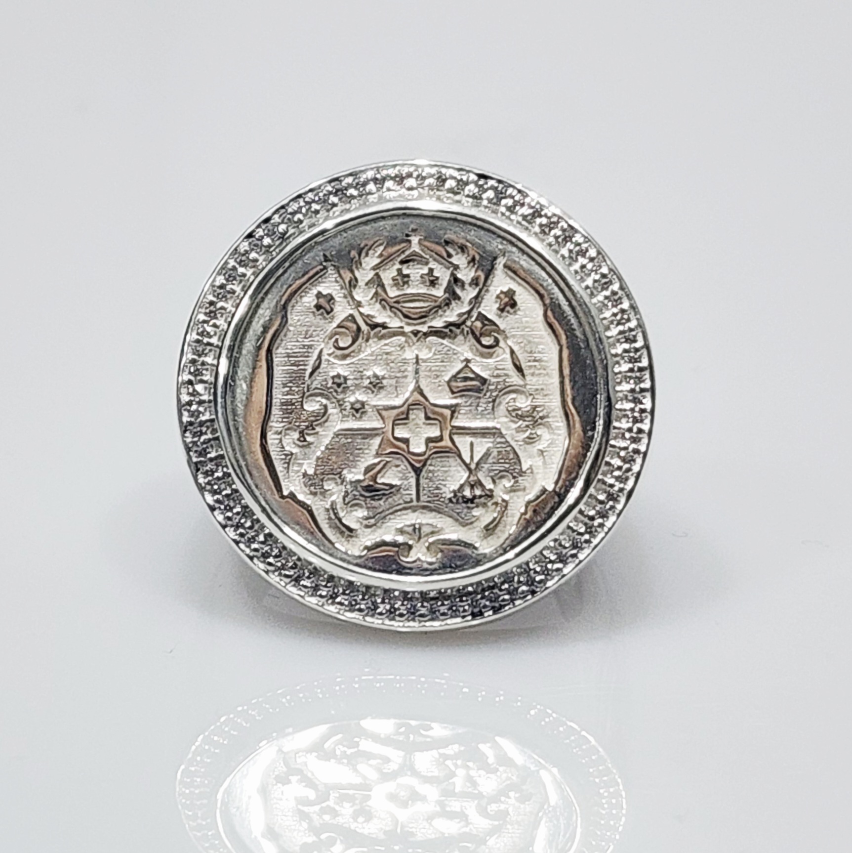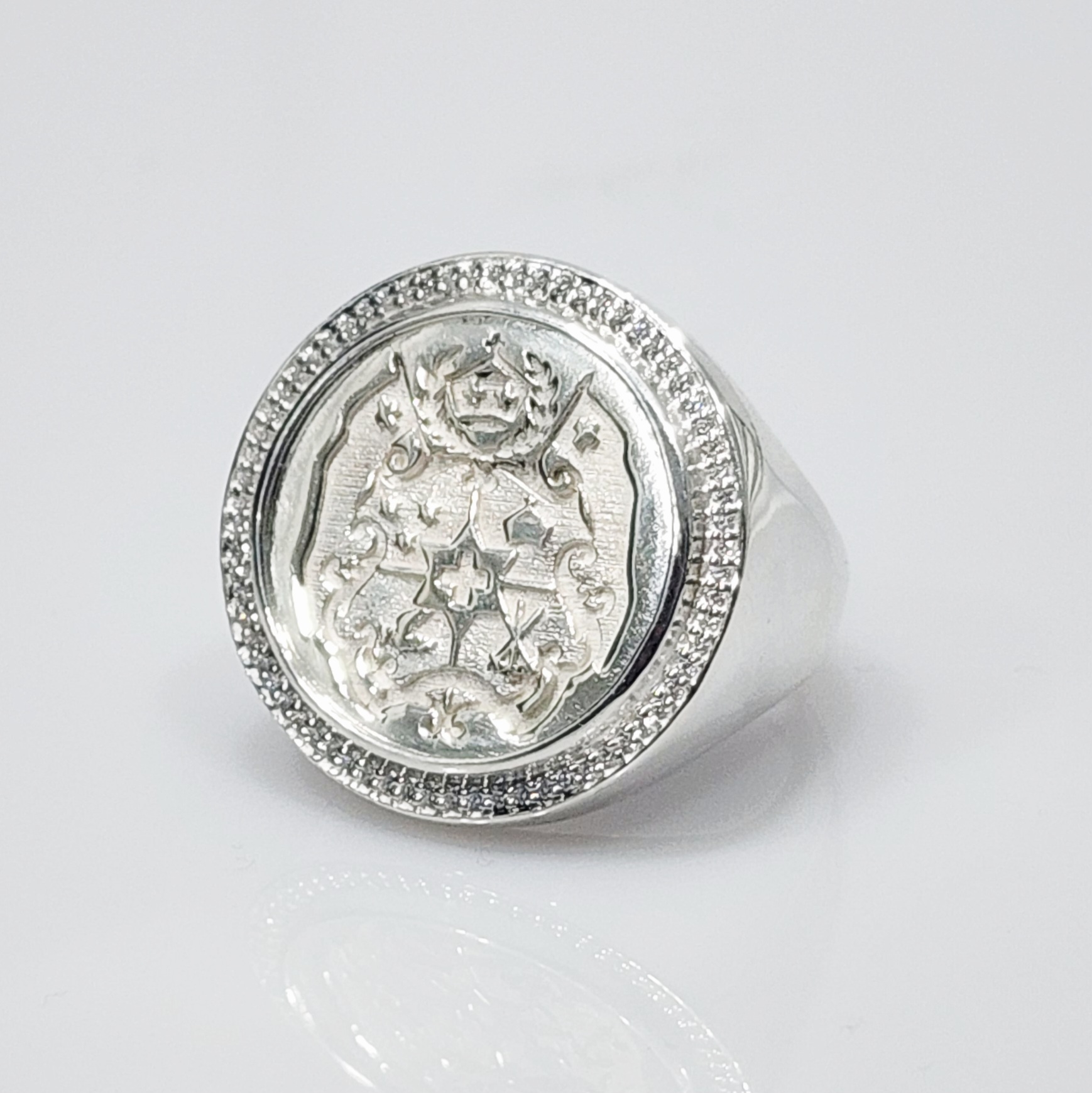 Encircling the emblem is a dazzling halo of claw-set cubic zirconia stones, adding a touch of brilliance that enhances the ring’s distinguished design. The full diameter of the ring’s top measures 27.5mm, creating a bold, eye-catching profile that exudes confidence and heritage.