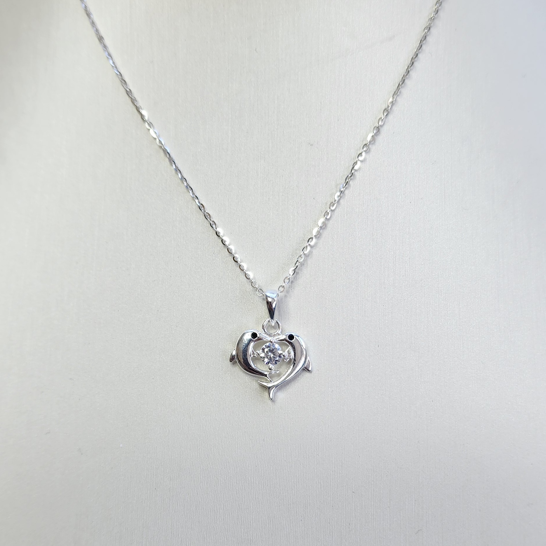 Sterling Silver Two Dolphins Pendant with CZ Setting and Sterling Silver Chain