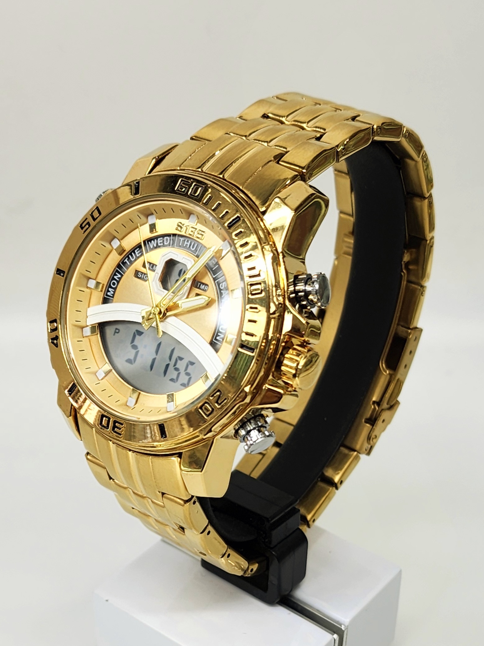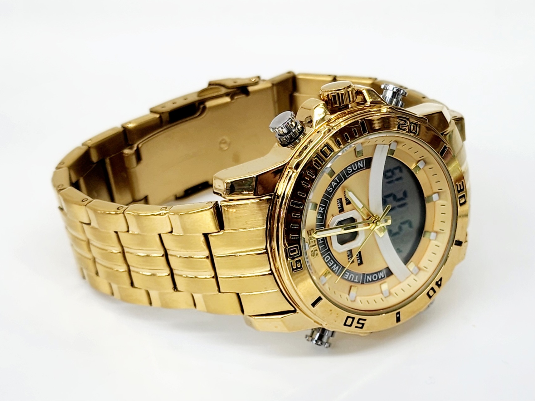 Stylish Dual Time Mens Analog/Digital Metal Strap, Multifunction LED Analog Gold Tone Band, Gold Dial Quartz Watch