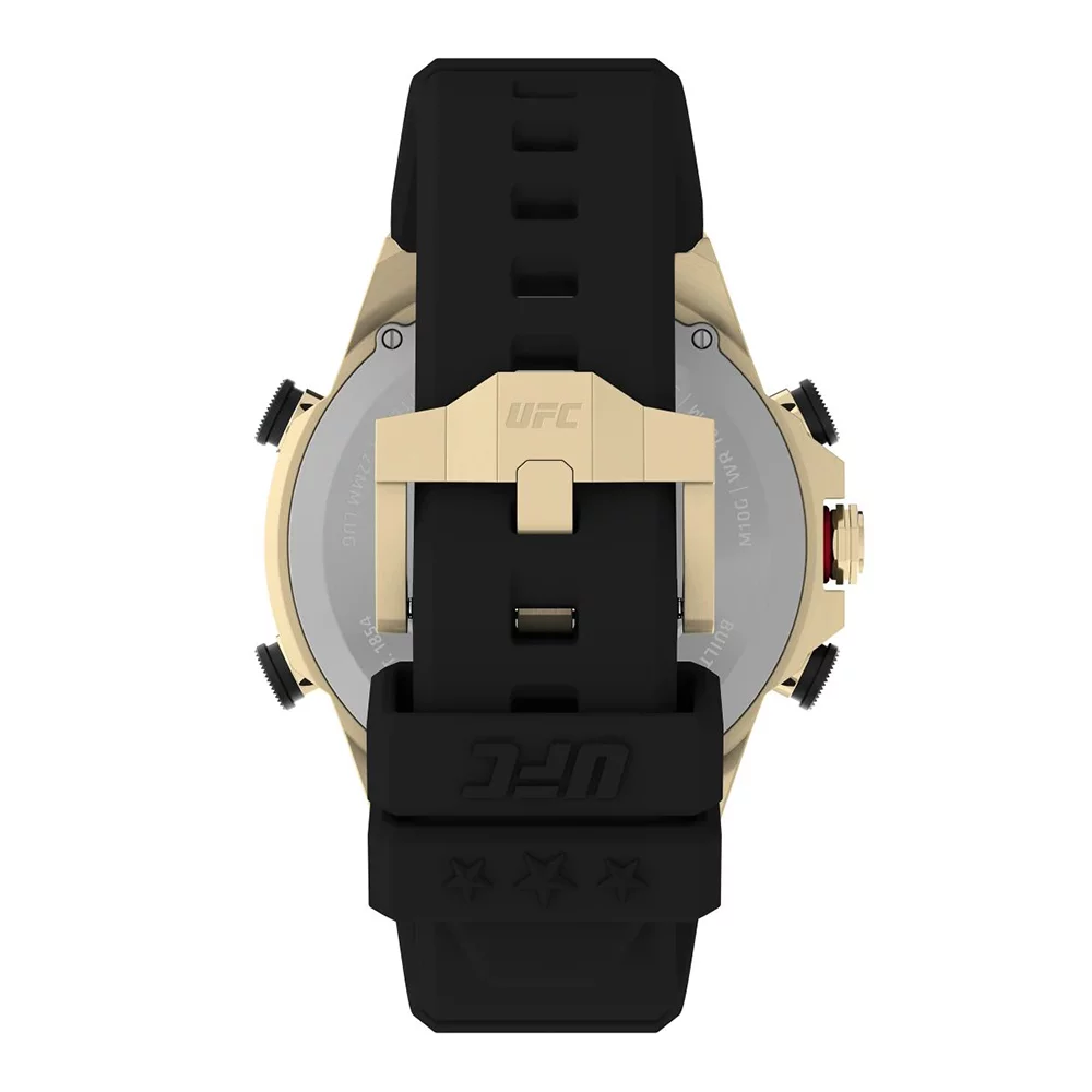Step into the octagon with the UFC Kick Digital. This timepiece packs a punch with its substantial 49mm stainless-steel case and bezel, along with a rugged black silicone strap that’s built to last. Featuring an octagonal sub-dial with alarm, split, chronograph, and AM/PM feature indicators, it?s perfect for keeping track of time whether it?s a?training or rest day. This watch is?also built with a countdown timer for timing workouts and ensuring optimal performance. Plus, it has an INDIGLO? backlight and 100m of water resistance, making it the perfect matchup no matter the time or the place