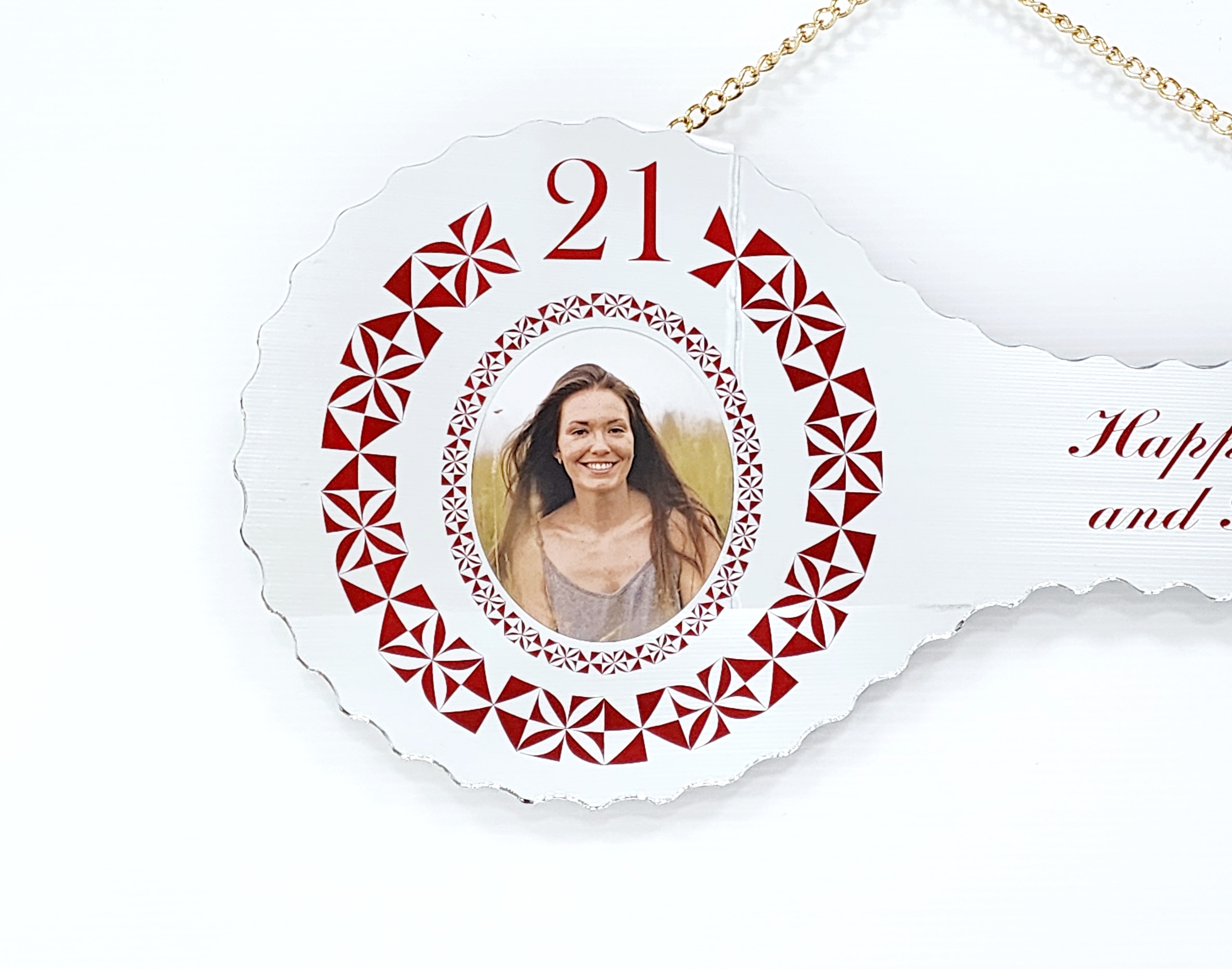 Our Mirrored 21st keys come with a 13mm MDF backing so your key can be signed by guests and loved ones. They also feature scalloped edges and a gold look chain to hang from. Dimensions: 524 x 205mm.