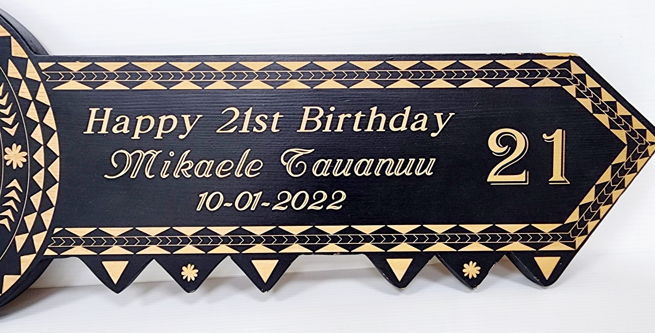 This exquisite wooden birthday key features a rich black-shaded finish, radiating warmth and sophistication. The key’s surface is elegantly adorned with 15 round paua shell inlays, each measuring 10mm in diameter, adding a vibrant iridescence that beautifully complements its earthy tones.