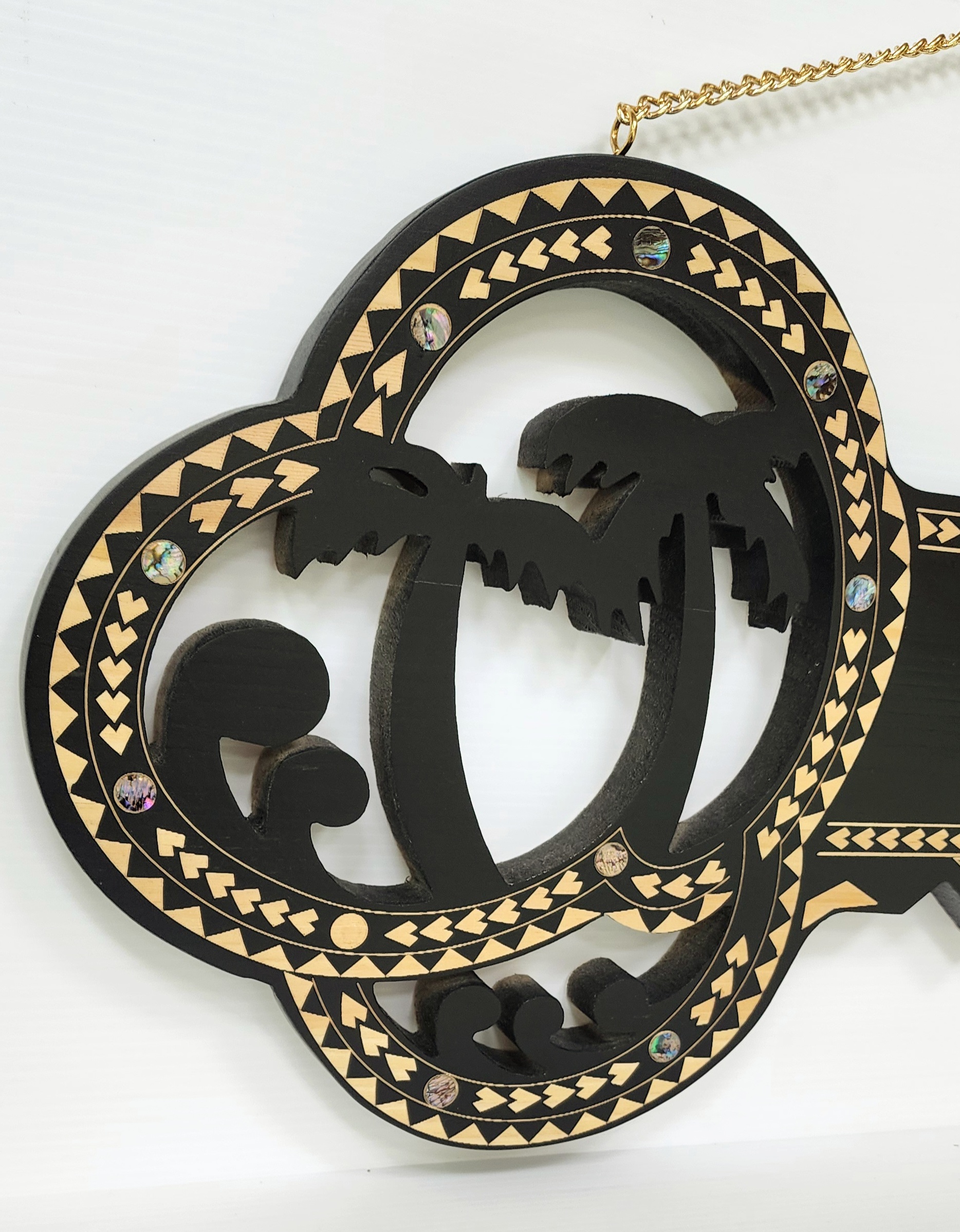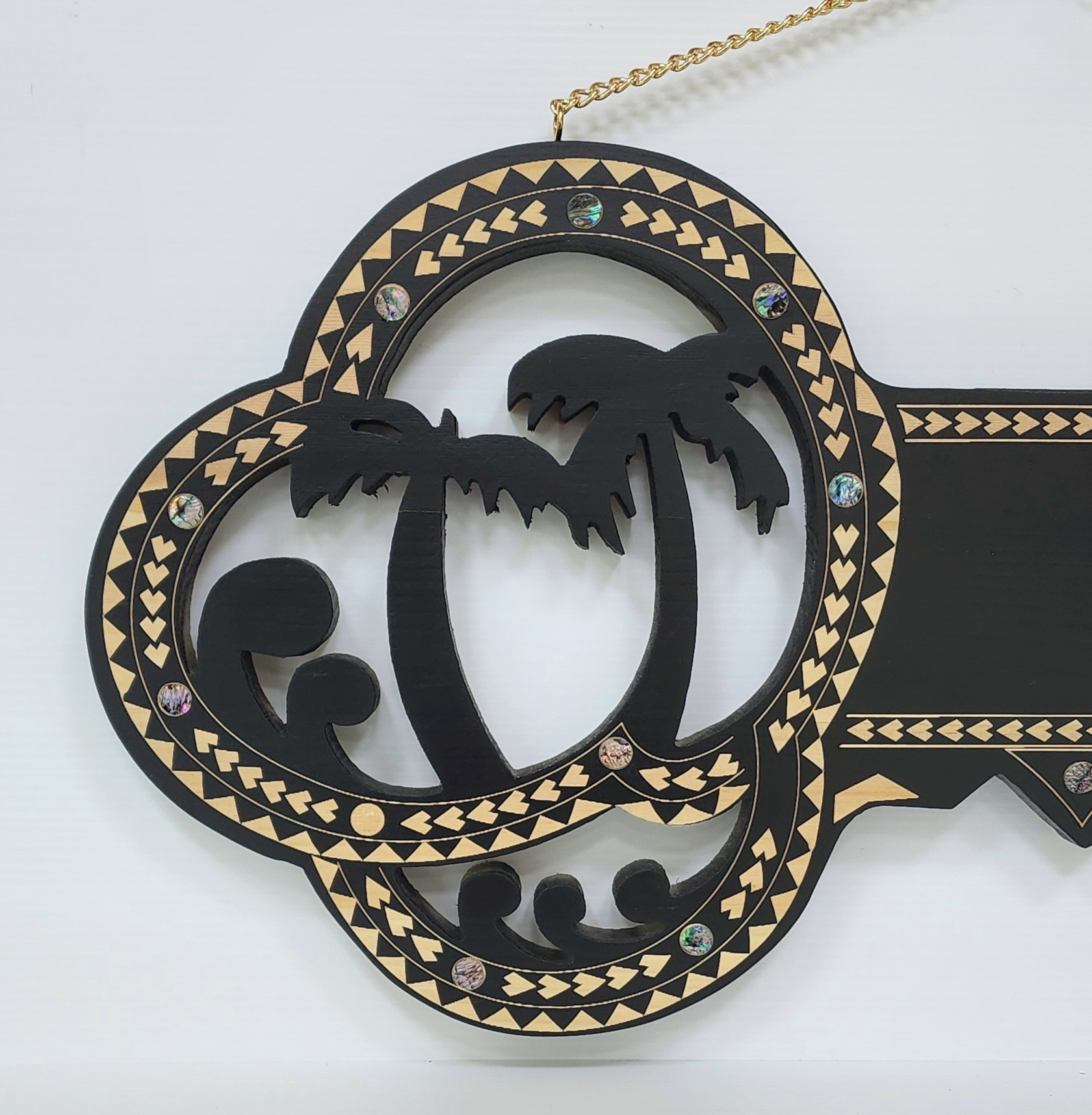 Wooden Key Birthday Key Black Shade Island Design With Paua Shell Round Inlays and Cutout Palm Trees – Design SJ2447